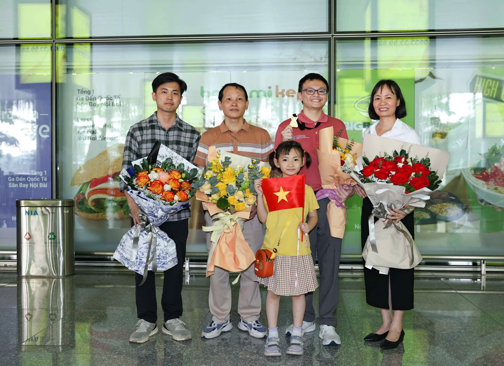 Sus familiares, profesores y amigos aguardaban desde temprano en el aeropuerto para darles la bienvenida con entusiasmo. Ngo Quang Minh (tercero desde la derecha); Nguyen Hoang Khoi (cuarto desde la derecha); Nguyen Manh Tuan (segundo desde la izquierda); y Giang Duc Dung (tercero desde la izquierda).
