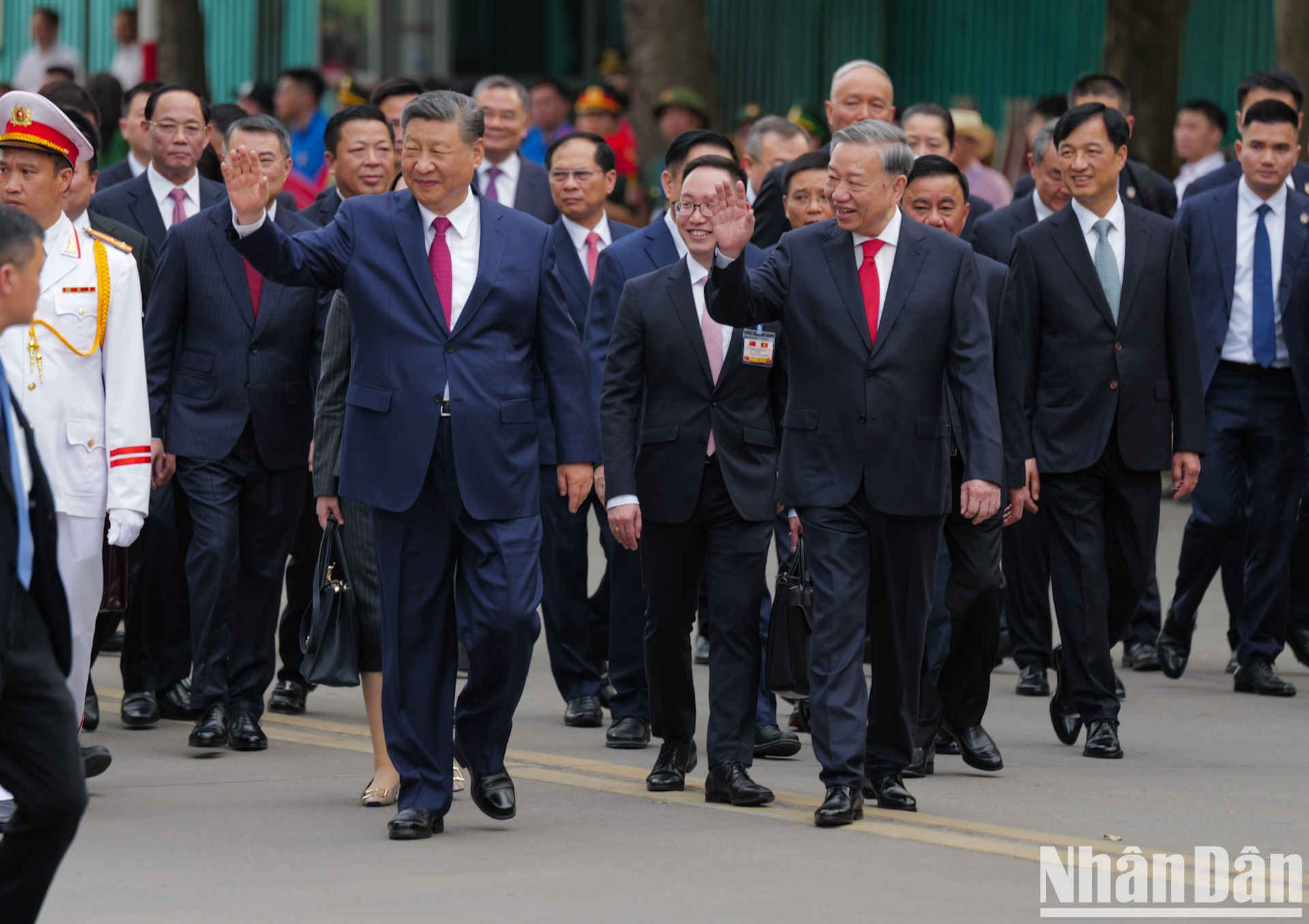 | Después de la recepción ceremonial ofrecida al secretario general del PCCh y presidente de China, Xi Jinping, en el Palacio Presidencial, en Hanói, el dirigente camina junto al secretario general del PCV, To Lam, a la sede del Comité Central de esa fuerza política vietnamita entre los vítores de la gente. |