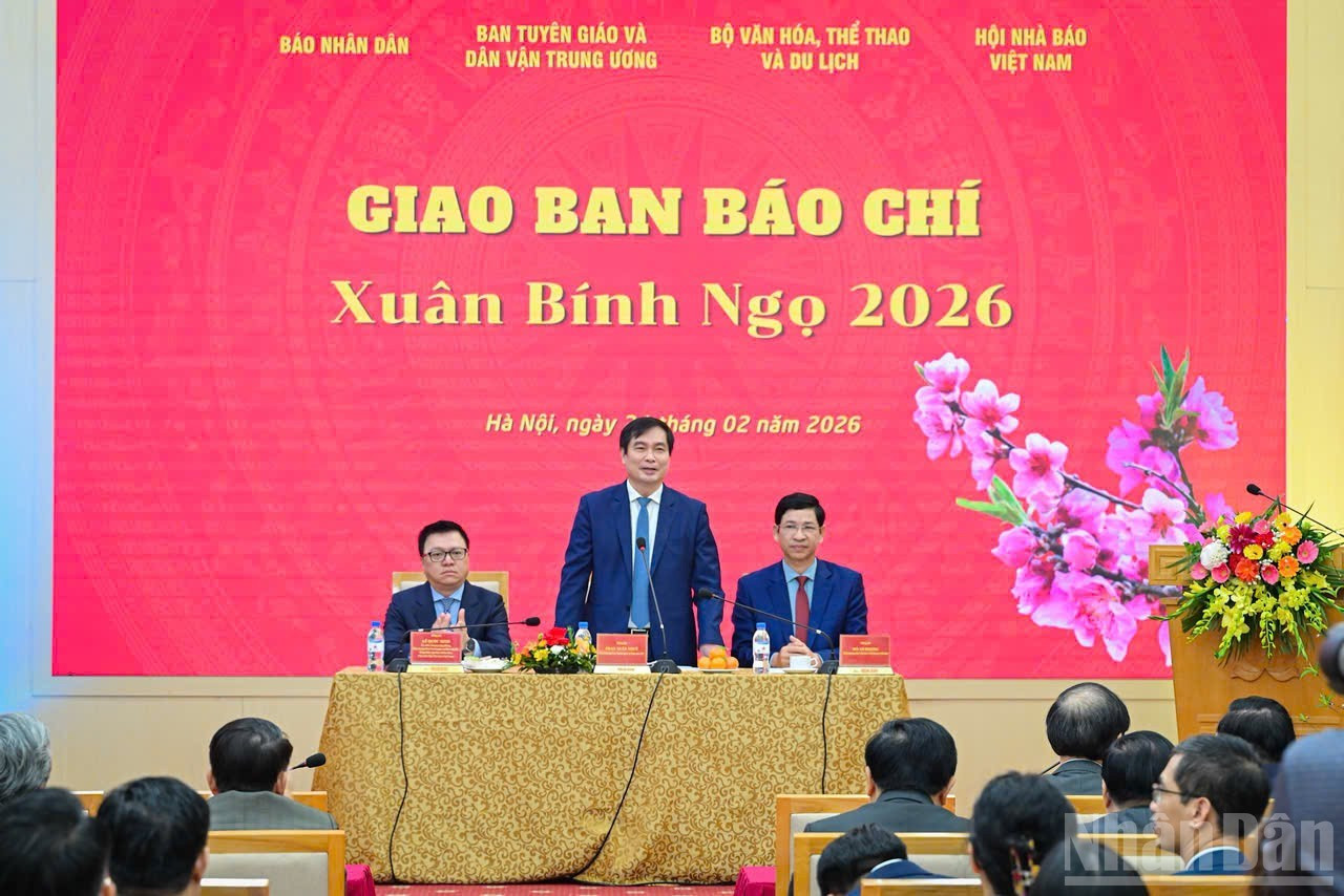 Asistentes al evento. El presidente-editor del periódico Nhan Dan, Le Quoc Minh, habla en la cita. Tong Van Thanh, jefe del Departamento de Prensa y Publicaciones de la Comisión de Propaganda y Movilización de Masas, presenta un informe sobre las actividades de prensa durante el Año Nuevo Lunar del Caballo 2026.