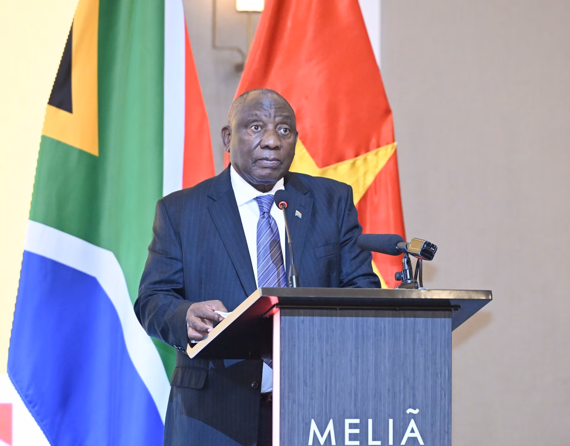 El presidente sudafricano Matamela Cyril Ramaphosa habla en la cita.