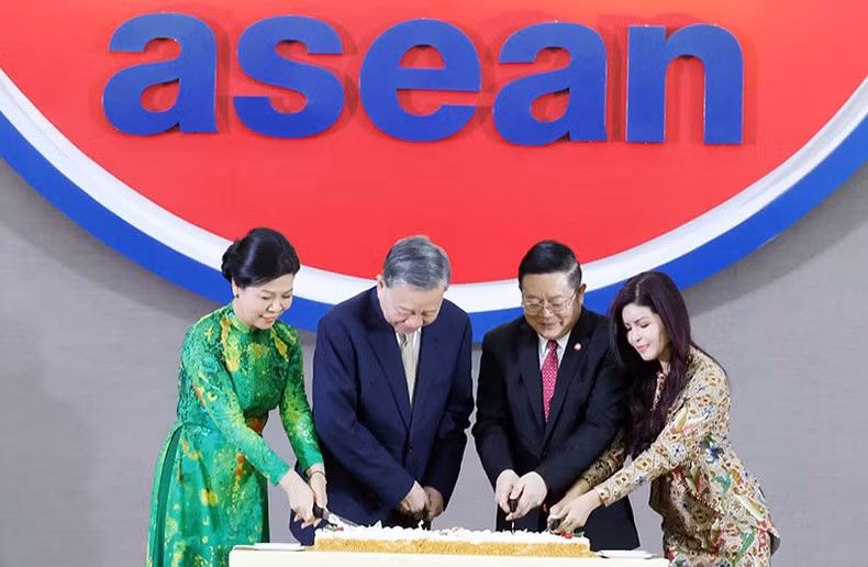 | El máximo dirigente partidista de Vietnam, To Lam, y su esposa, y el secretario general de la Asean, Kao Kim Hourn y su cónyuge realizan el acto de saludo a la bandera de la Asean. |