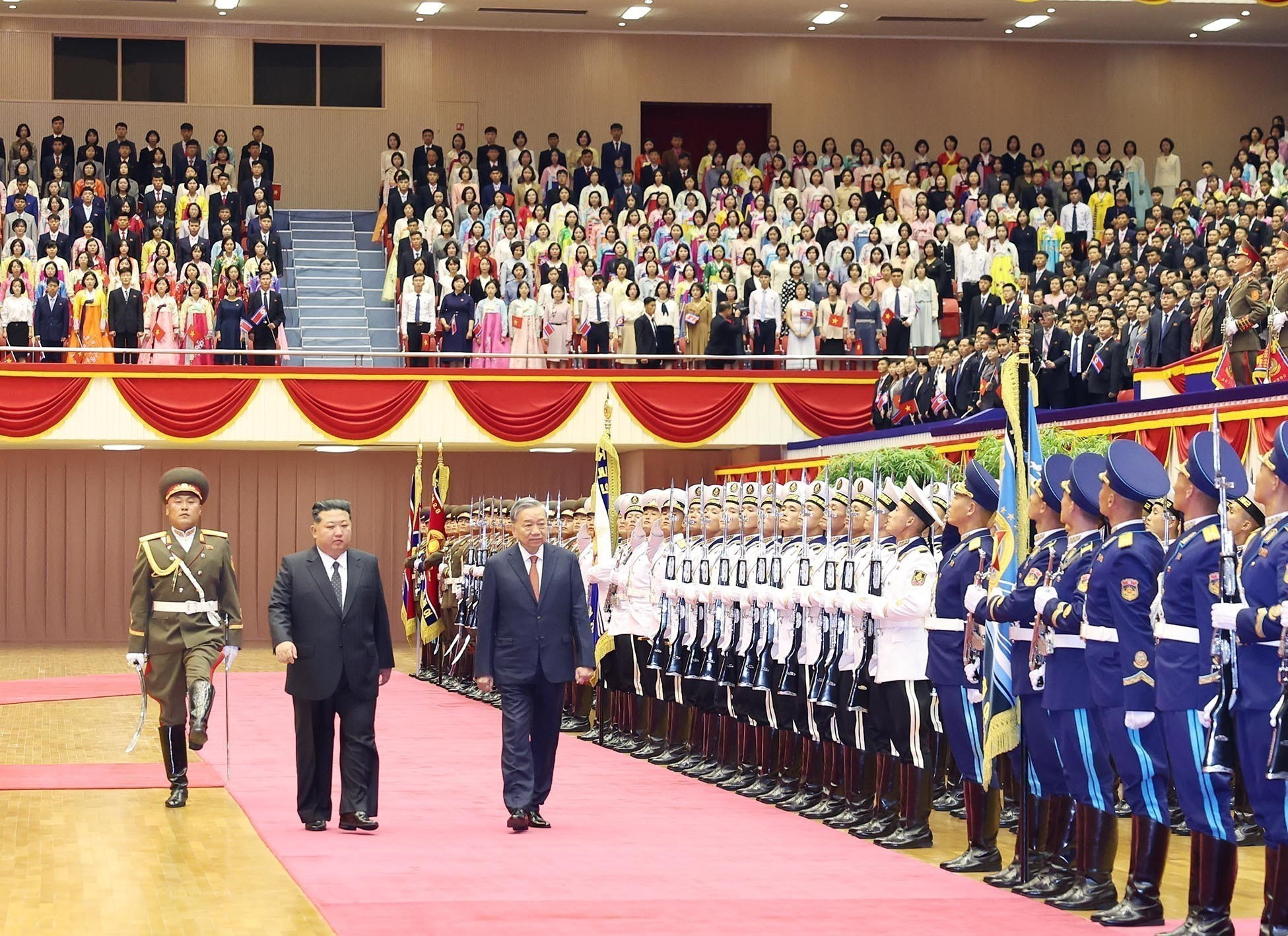 El secretario general del Partido Comunista de Vietnam, To Lam y el secretario general del Partido del Trabajo de Corea y titular de la Comisión de Asuntos Estatales de Corea del Norte, Kim Jong Un, pasan revista a la guardia de honor.
