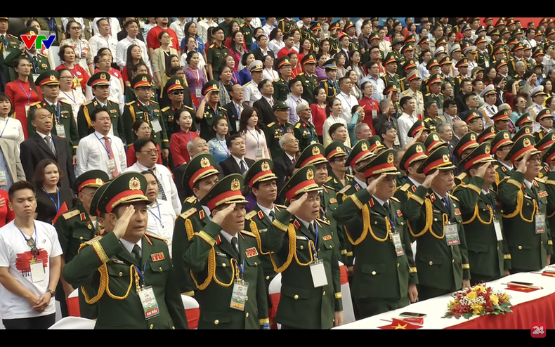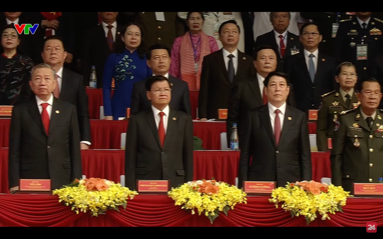 | Dirigentes del Partido Comunista y Estado, y los invitados internacionales asisten a la ceremonia de izamiento de la bandera de Vietnam. |