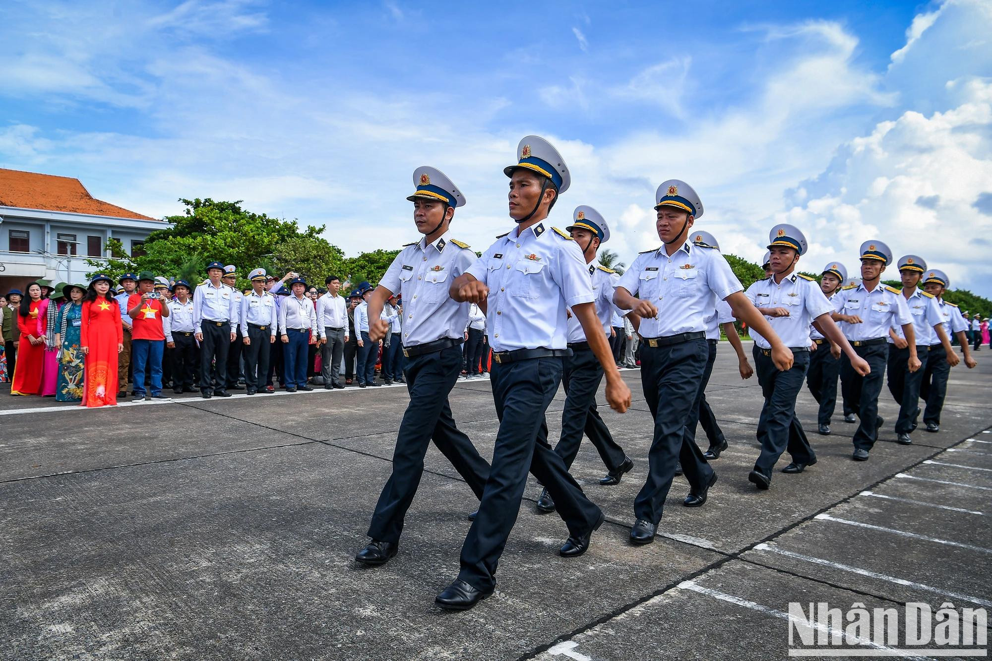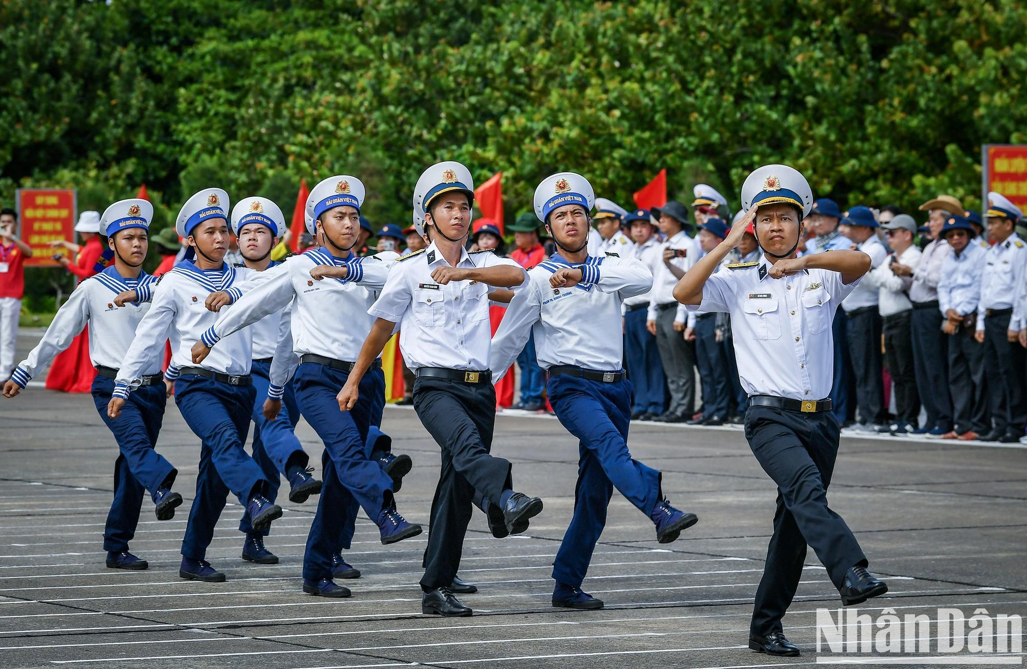 | El desfile de oficiales y soldados en el archipiélago de Truong Sa se desarrolla en un ambiente solemne. |