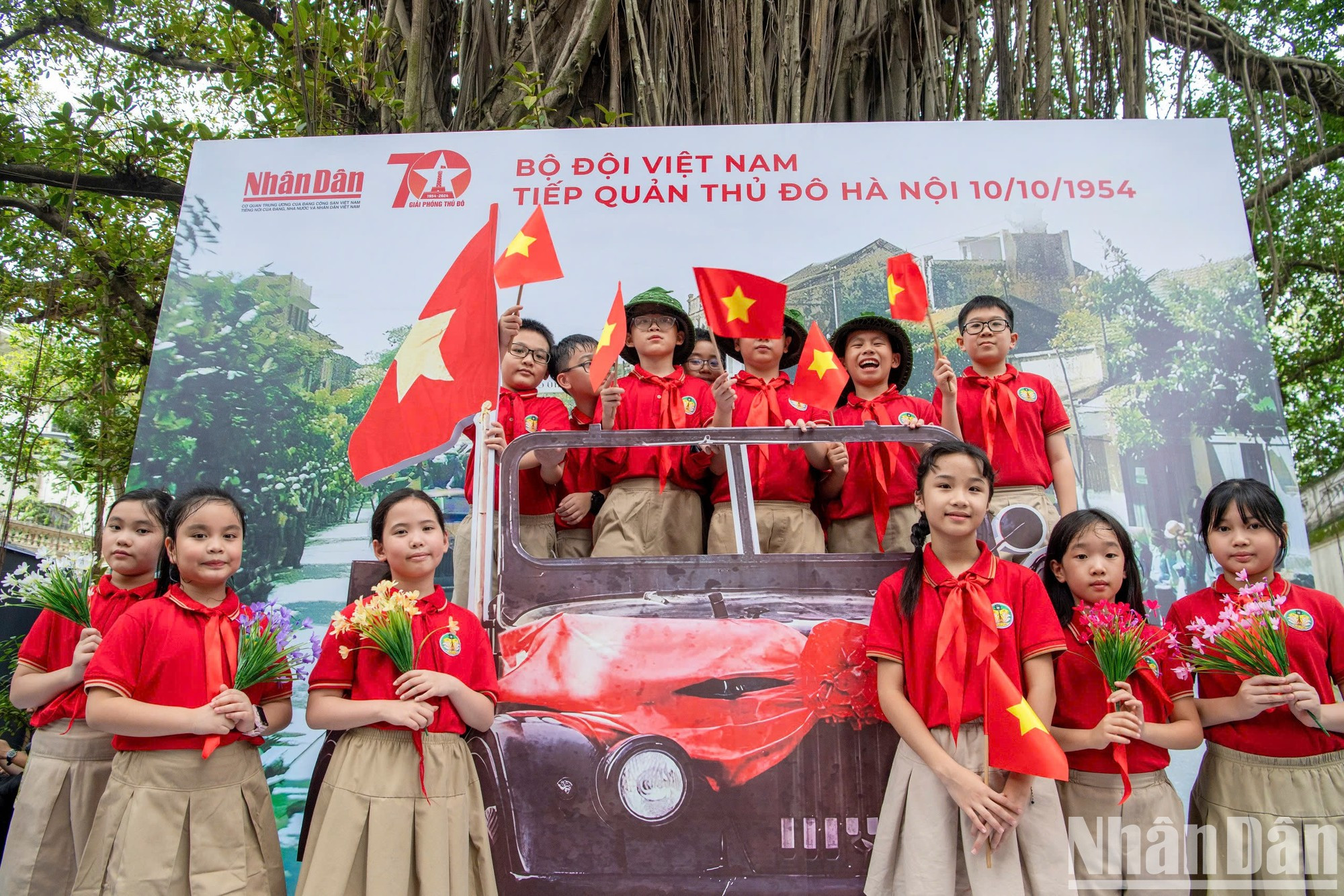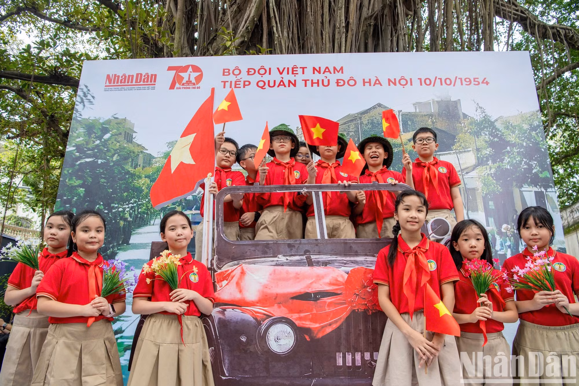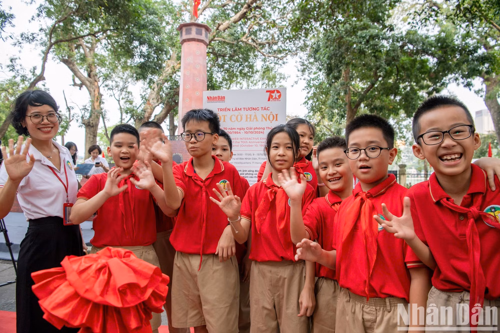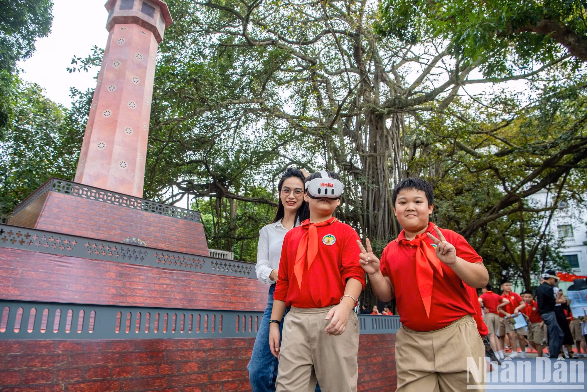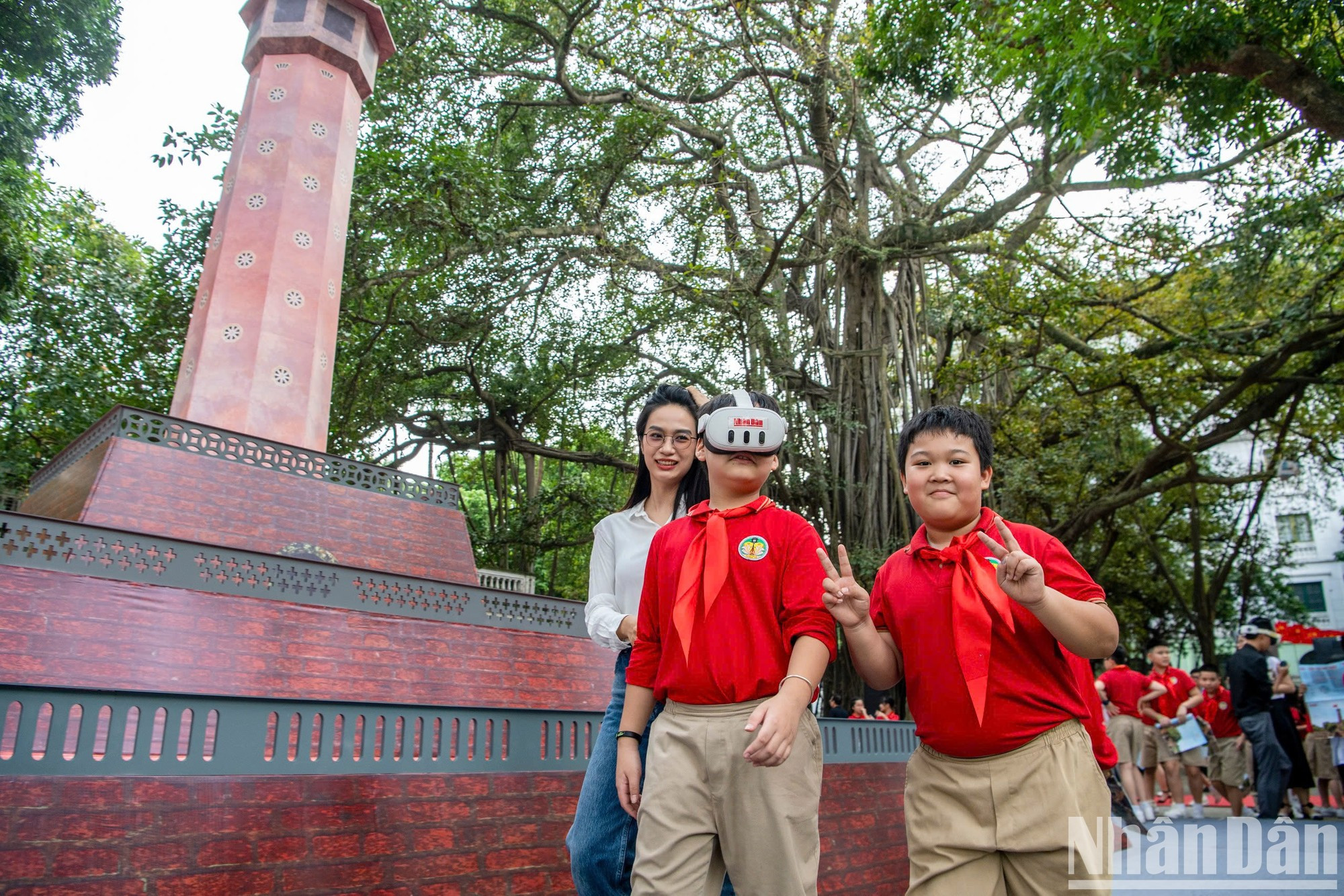 | Los alumnos visitan el maqueta de la Torre de la Bandera de Hanói, colocada en la sede del periódico Nhan Dan. |