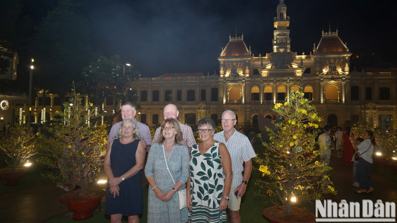 | Mucha gente se reúne en la calle de flores, en el barrio Phu My Hung del distrito 7, para tomar fotografías en vísperas del Año Nuevo Lunar 2025. |