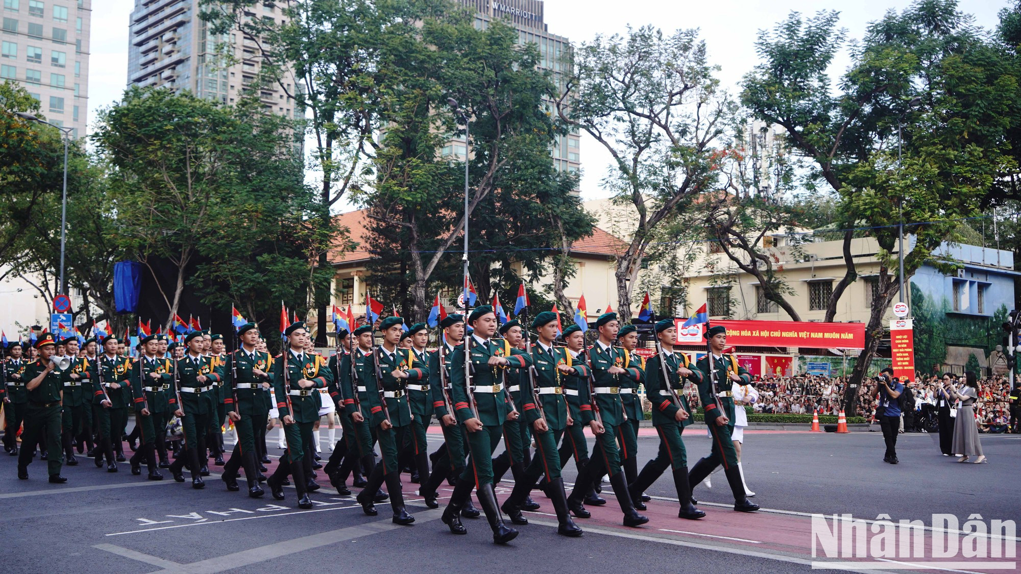 | La formación del Ejército Popular de Laos marcha en el evento. Su presencia demuestra la solidaridad y el estrecho vínculo entre Vietnam y Laos en la preservación de la paz y el desarrollo. |