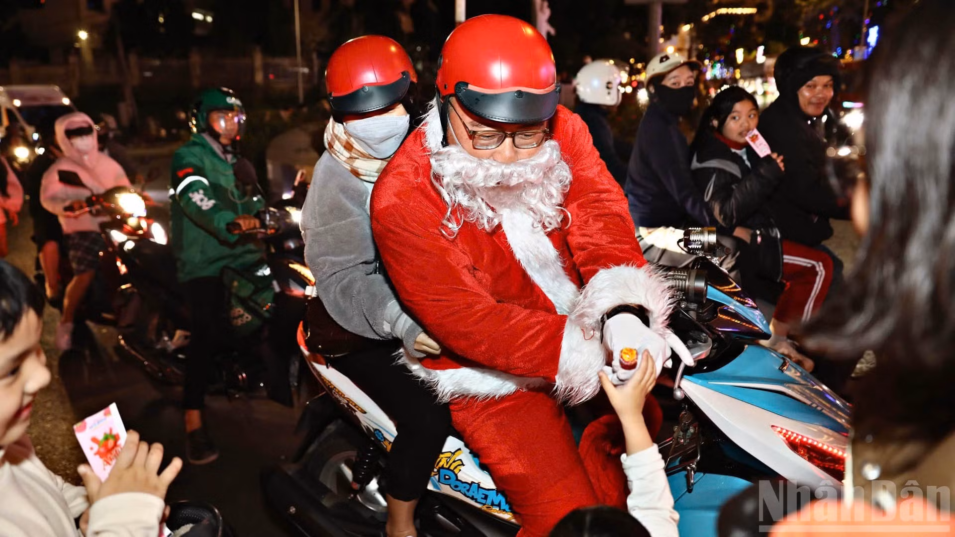 Muchos Papá Noel aparecen en las calles, entregando regalos a los niños en la fría noche.