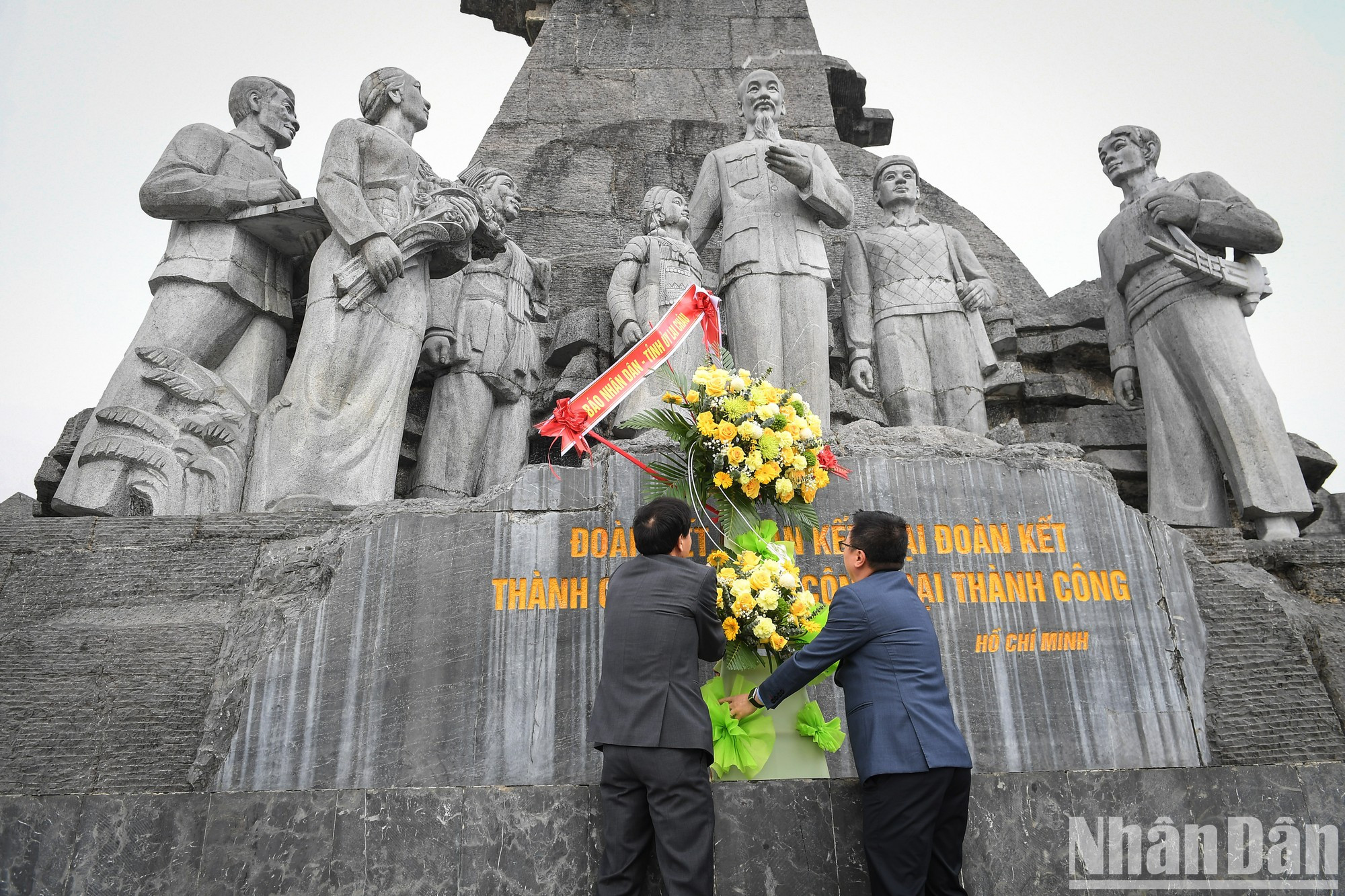 | En la mañana del mismo día, la delegación de Nhan Dan ofrece flores ante el Monumento al Presidente Ho Chi Minh y los grupos étnicos de Lai Chau. |