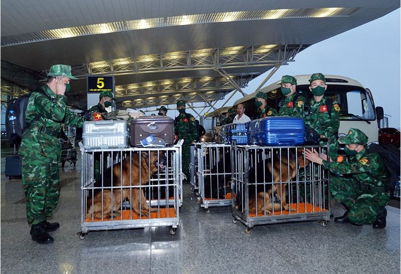 | El grupo del ingenieros militares llega al Aeropuerto Internacional Noi Bai. |