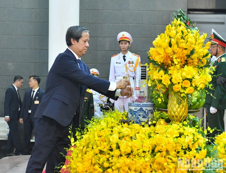 | La delegación de la Oficina Presidencial, encabezada por el miembro del Comité Central del PCV y jefe de la Oficina Presidencial, Le Khanh Hai, rinde homenaje al secretario general Nguyen Phu Trong. |