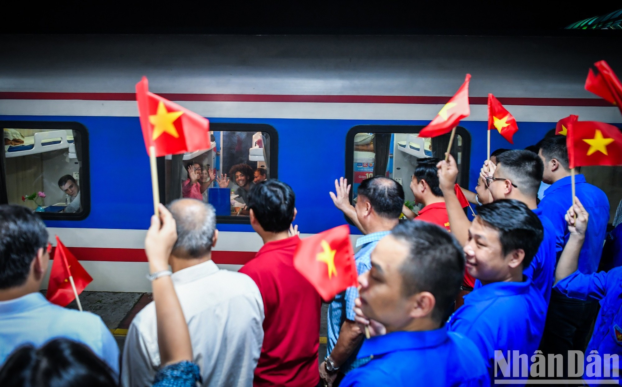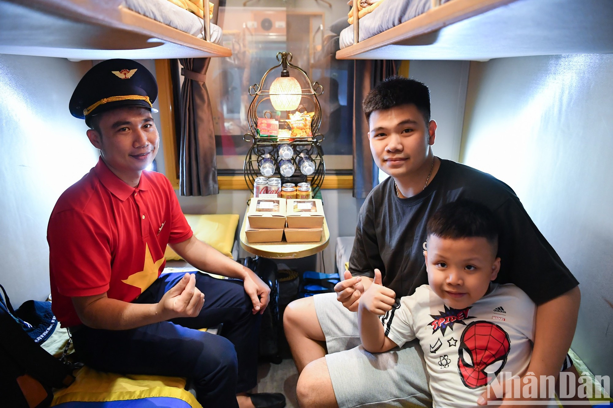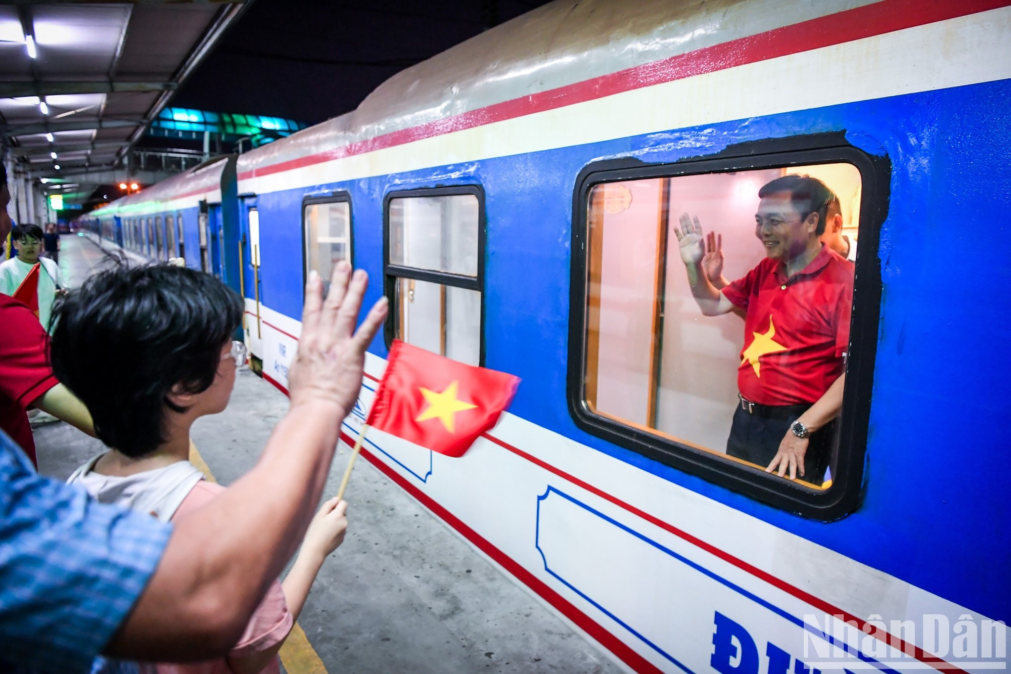 | La noche del 30 de agosto, los pasajeros de los trenes SE3 y SE19, que partían de la estación de Hanói, quedaron sorprendidos al ver a todo el personal ferroviario con camisetas con una bandera roja y una estrella amarilla. |