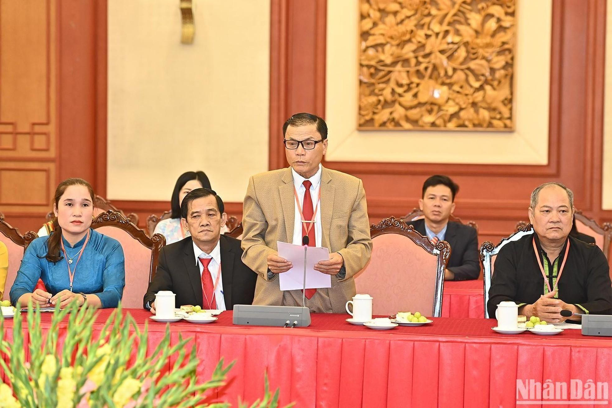 | Do Van Chien, miembro del Secretariado del Comité Central del Partido y presidente del Frente de la Patria de Vietnam, entrega flores y da las gracias a Phu Trong. |