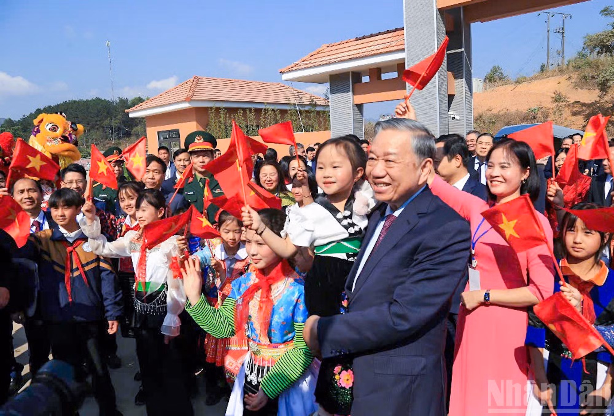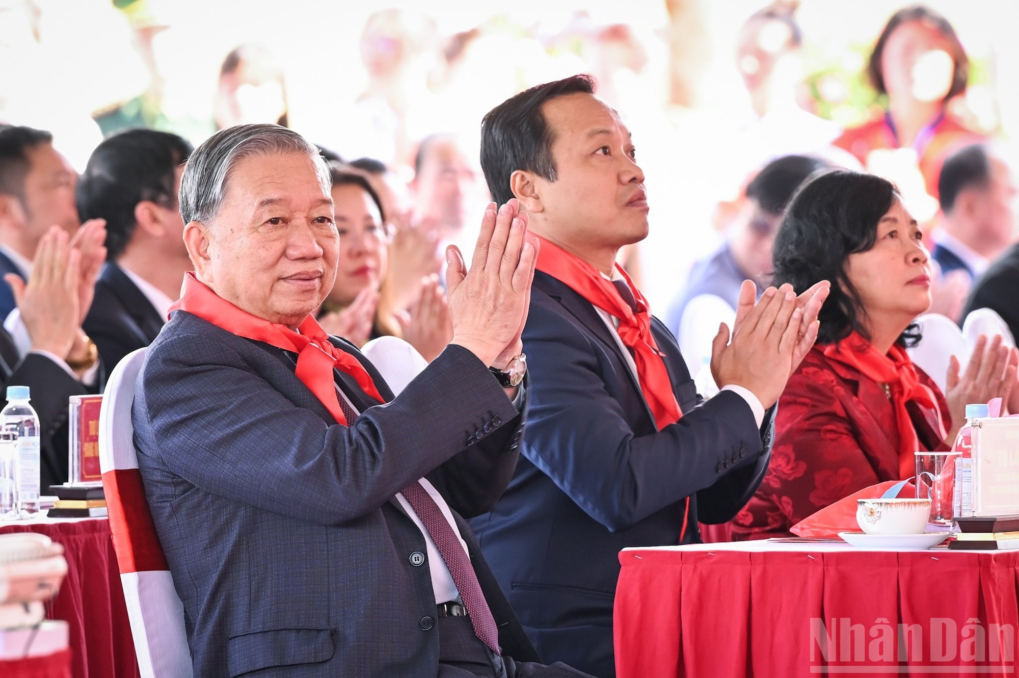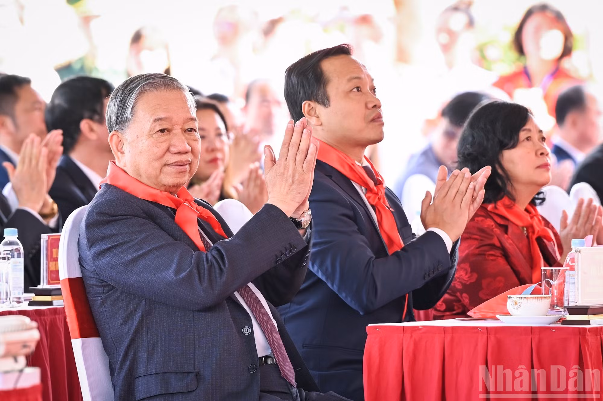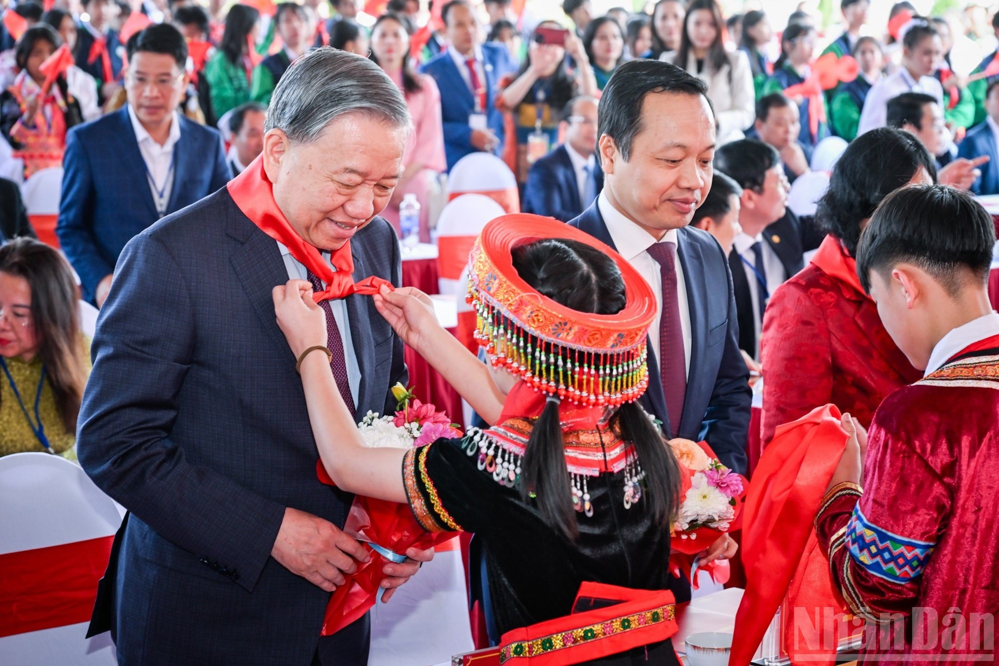 Los alumnos de la Escuela Internado de Si Pa Phin entregan pañuelos rojos al secretario general del PCV, To Lam, y los líderes del Partido y del Estado.