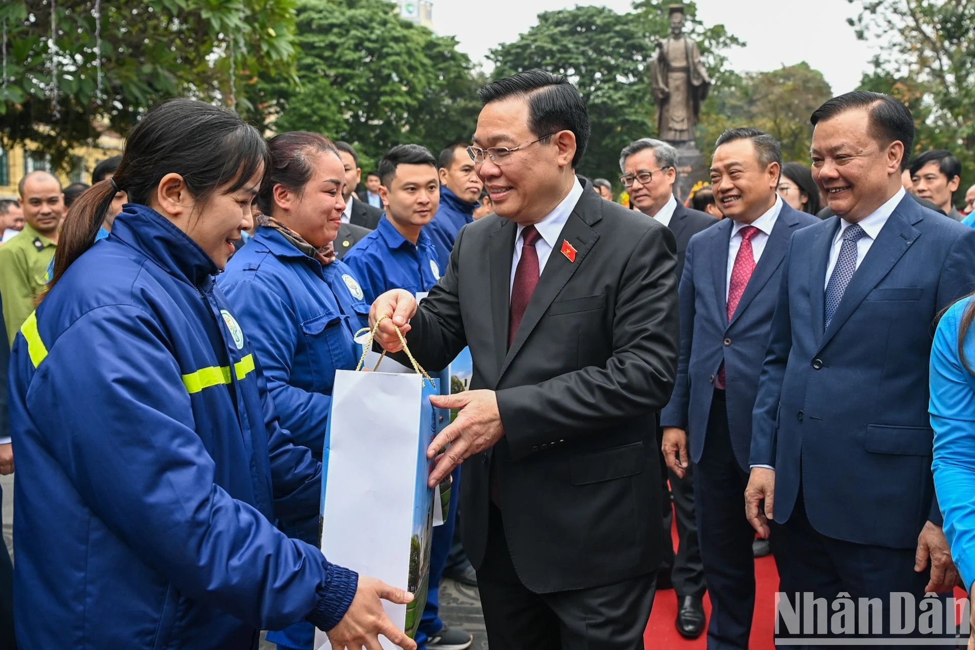 | El vicepresidente de la Asamblea Nacional Nguyen Khac Dinh felicita por el Tet a los trabajadores capitalinos. |