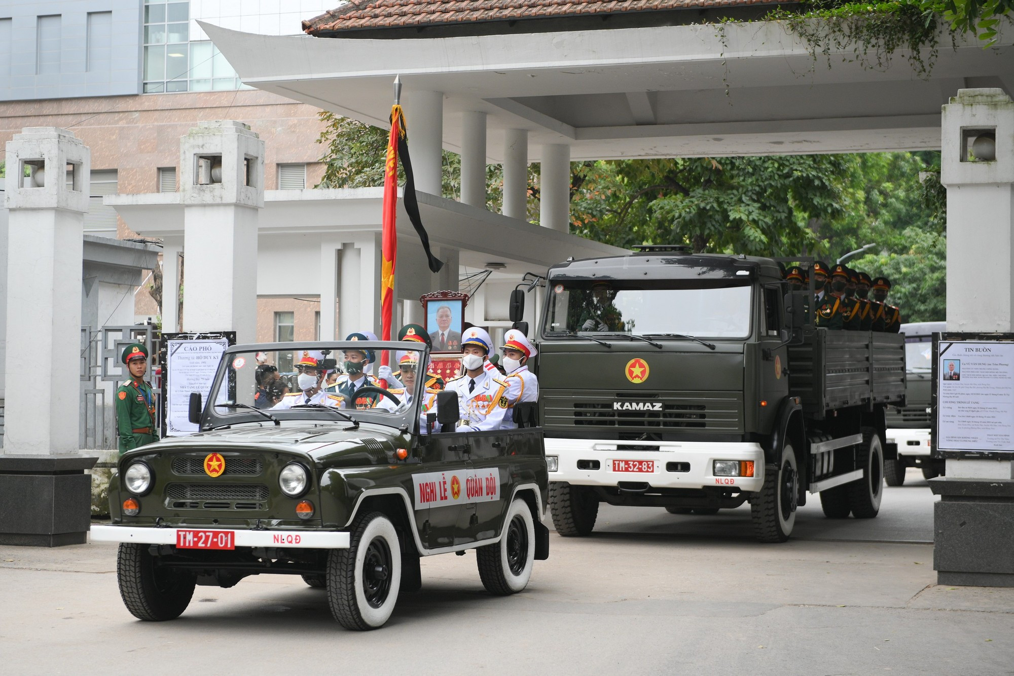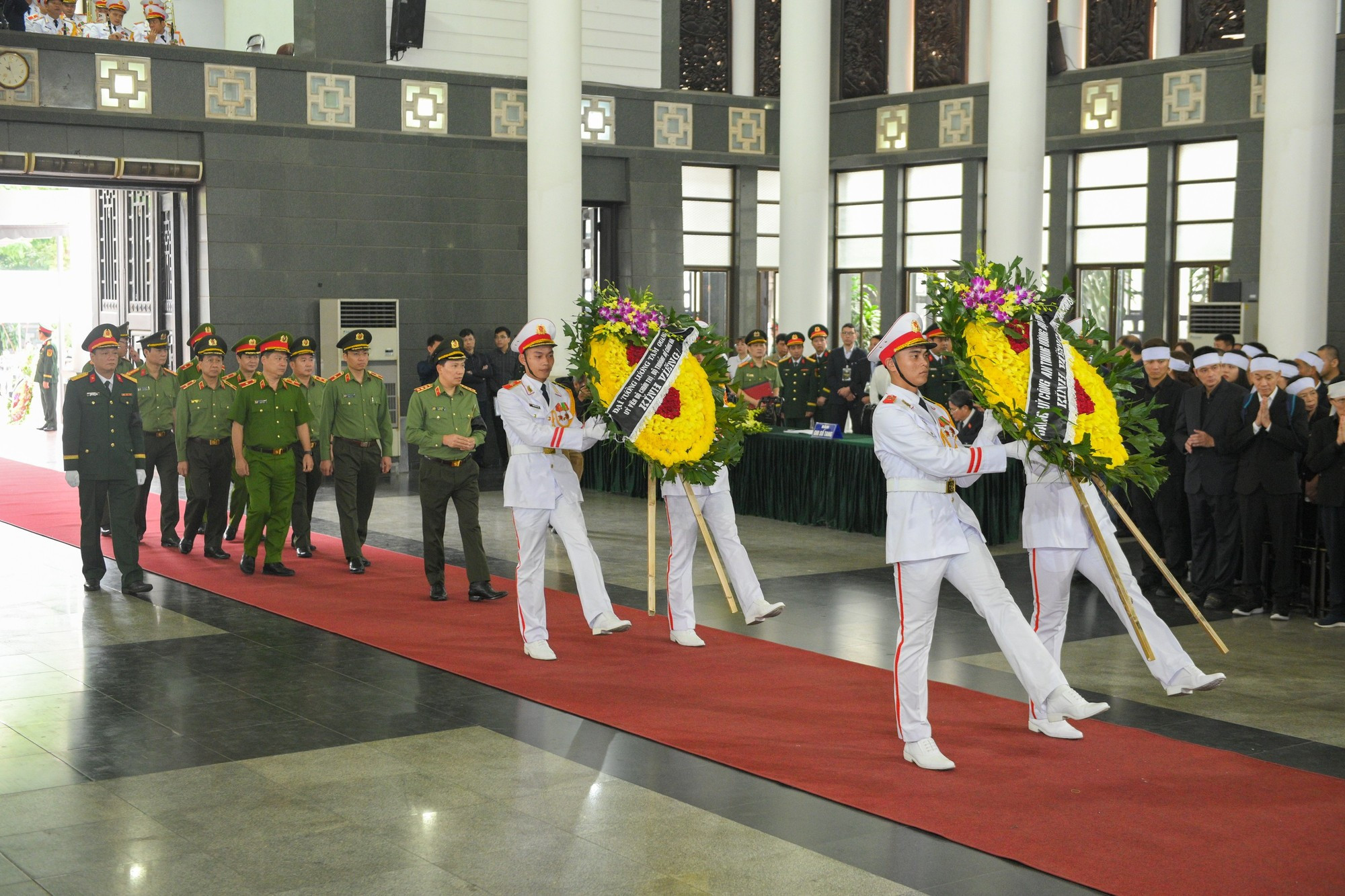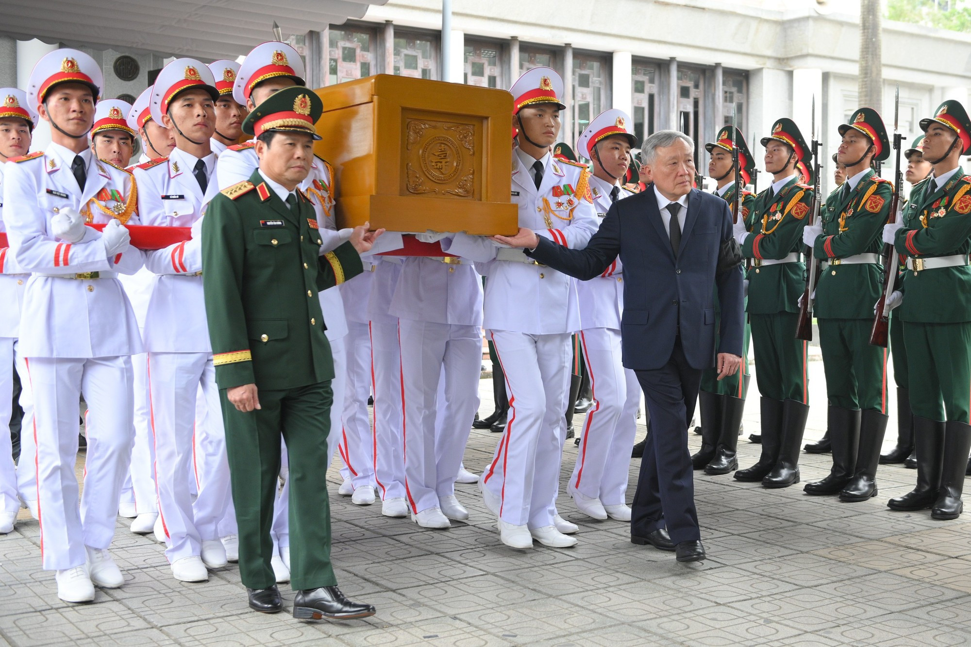 El viceprimer ministro permanente Nguyen Hoa Binh y el jefe del Estado Mayor del Ejército Popular de Vietnam, el viceministro de Defensa Nguyen Tan Cuong, llevan el féretro del camarada Tran Phuong al coche fúnebre.