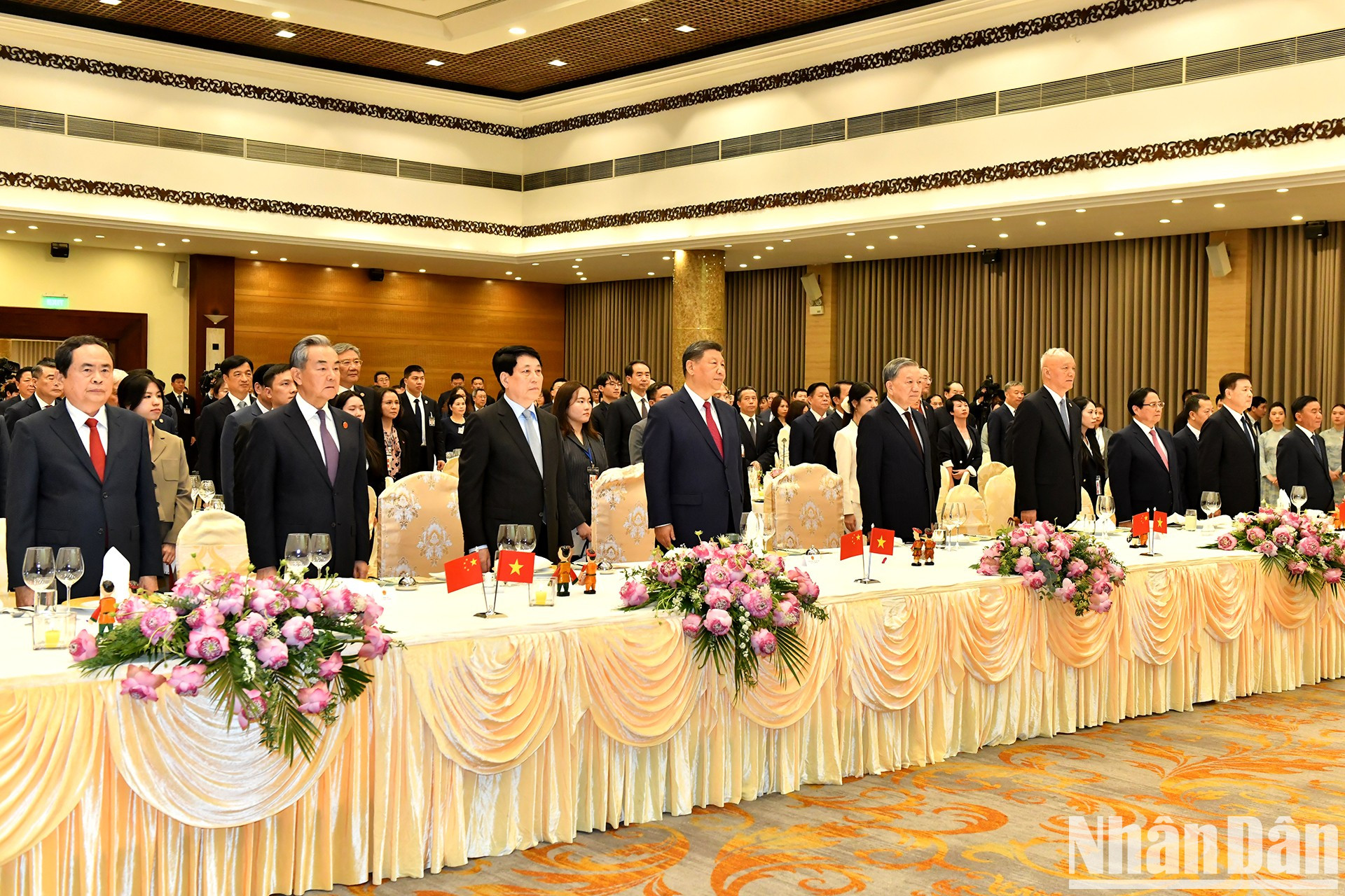 | El secretario general To Lam, el presidente Luong Cuong, y el máximo dirigente de China, Xi Jinping, disfrutan de las actuaciones. |