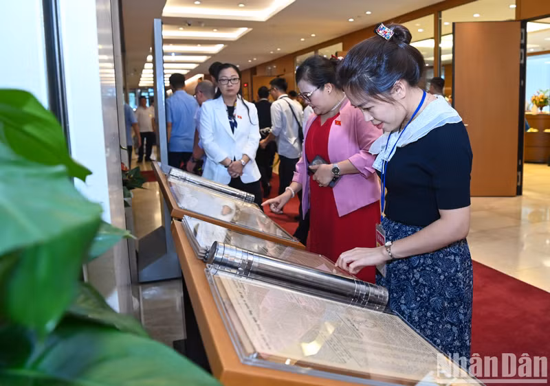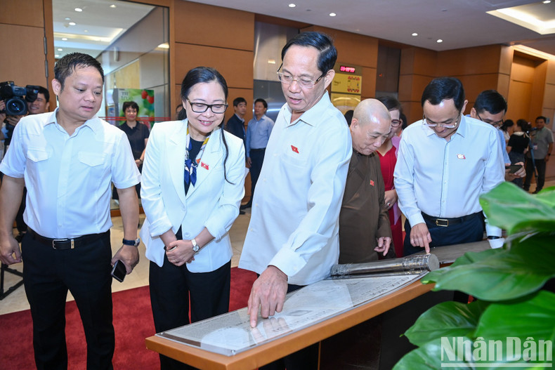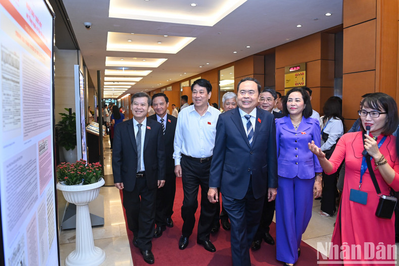 | El presidente del país, Luong Cuong, el titular de la Asamblea Nacional, Tran Thanh Man, y funcionarios del Partido y el Estado visitan la exhibición. |