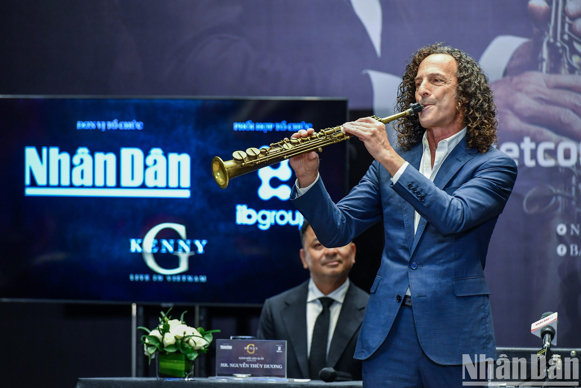 | El leyendario saxofonista Kenny G; el presidente-editor del periódico Nhan Dan, Le Quoc Minh; y el presidente de la junta directiva del Group IB Vietnam, Nguyen Thuy Duong. |