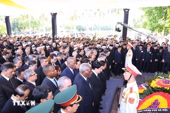 | Representantes de la familia y líderes del Partido y del Estado caminan alrededor de la tumba para despedirse del secretario general Nguyen Phu Trong. |