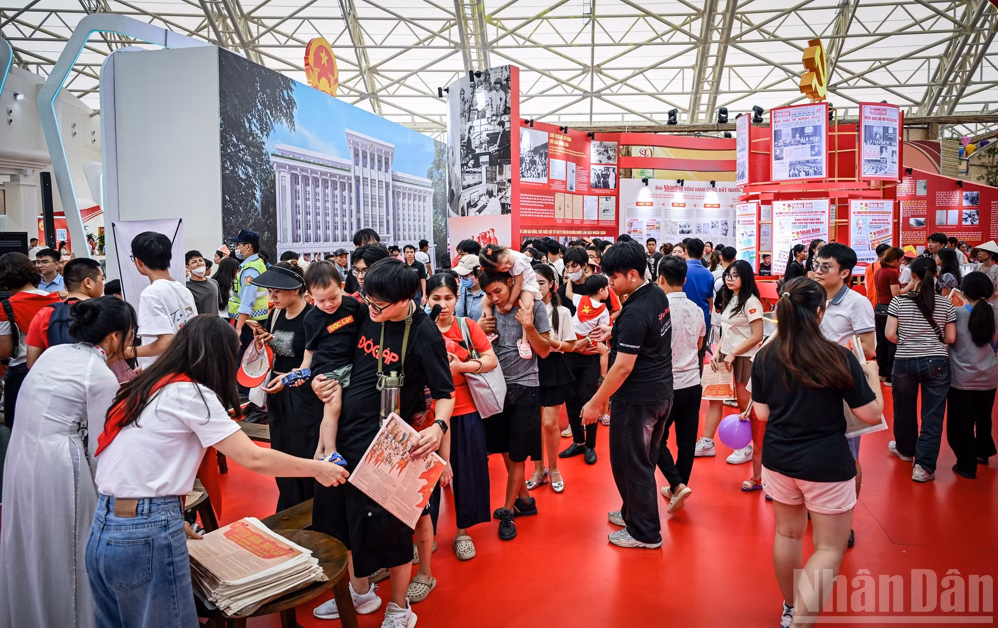 El área de exhibición del periódico Nhan Dan y la significativa publicación reciben una atención especial de los jóvenes.