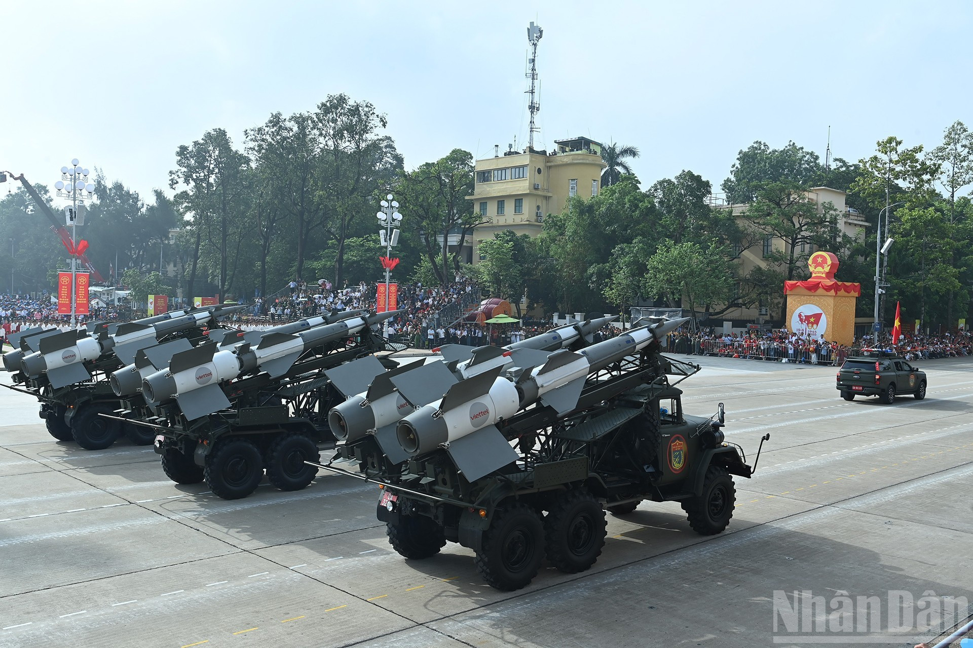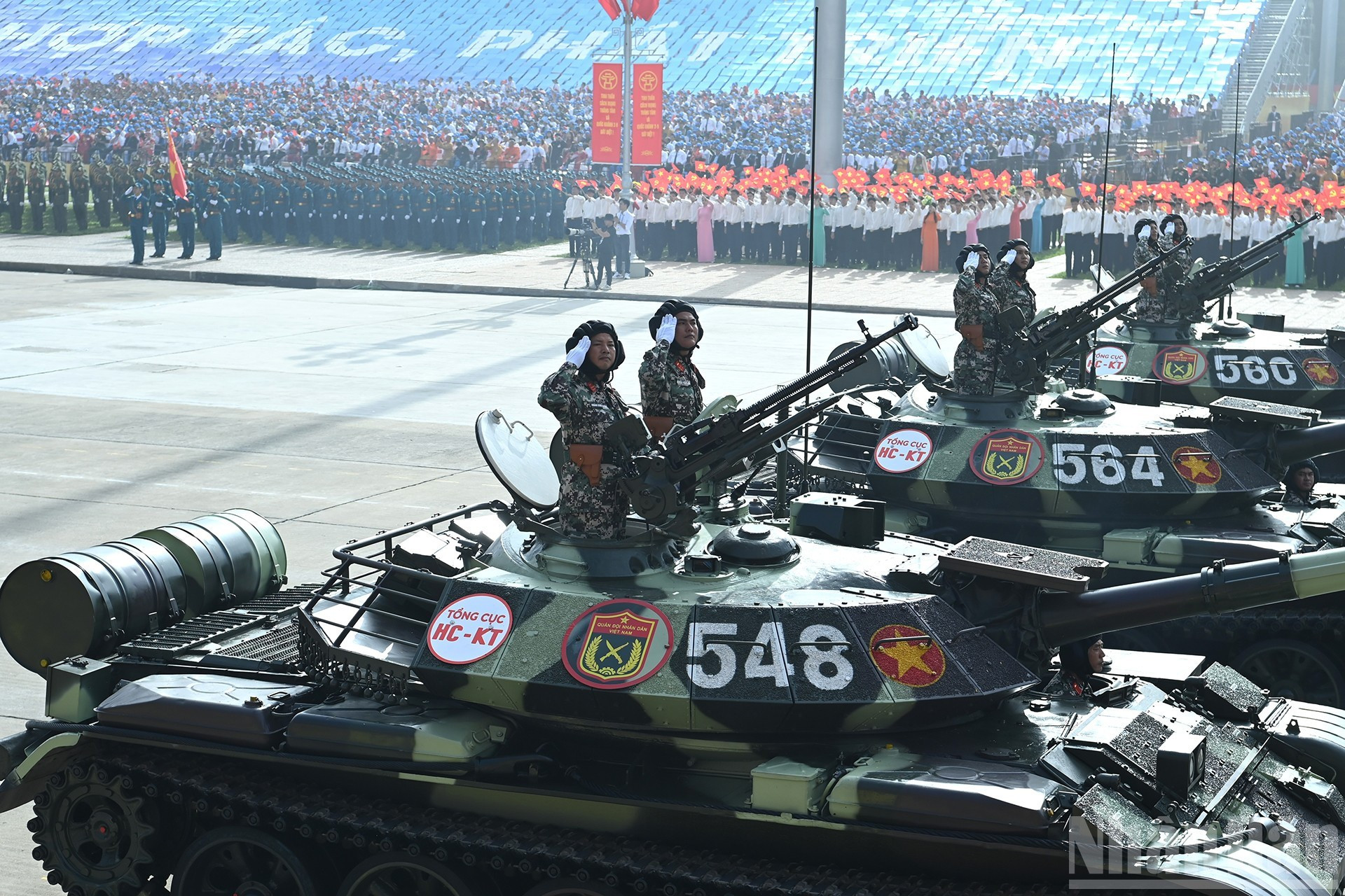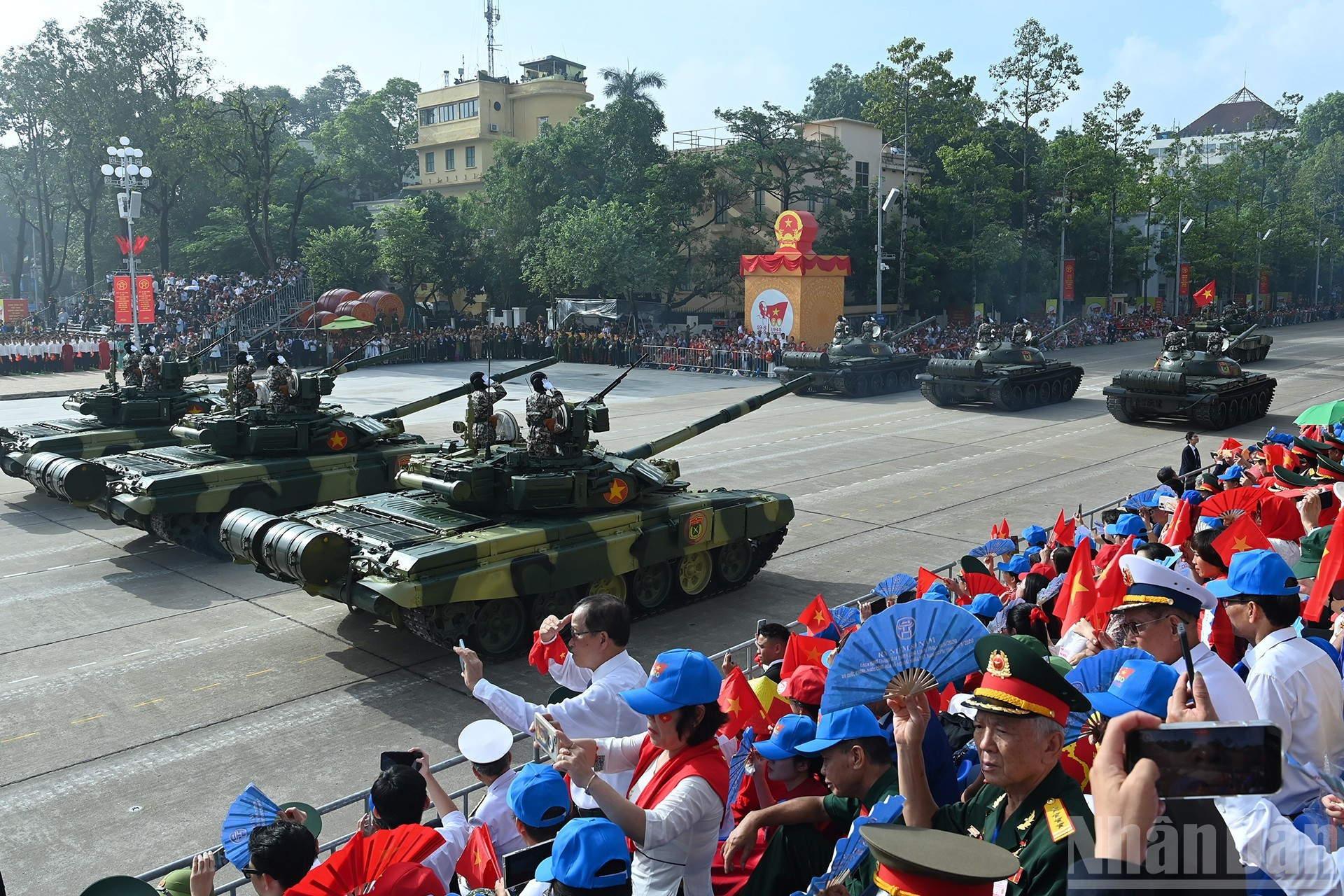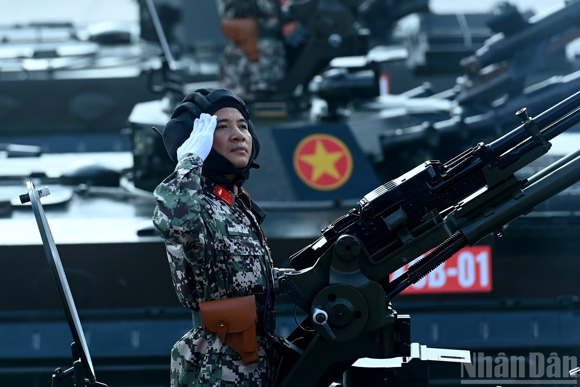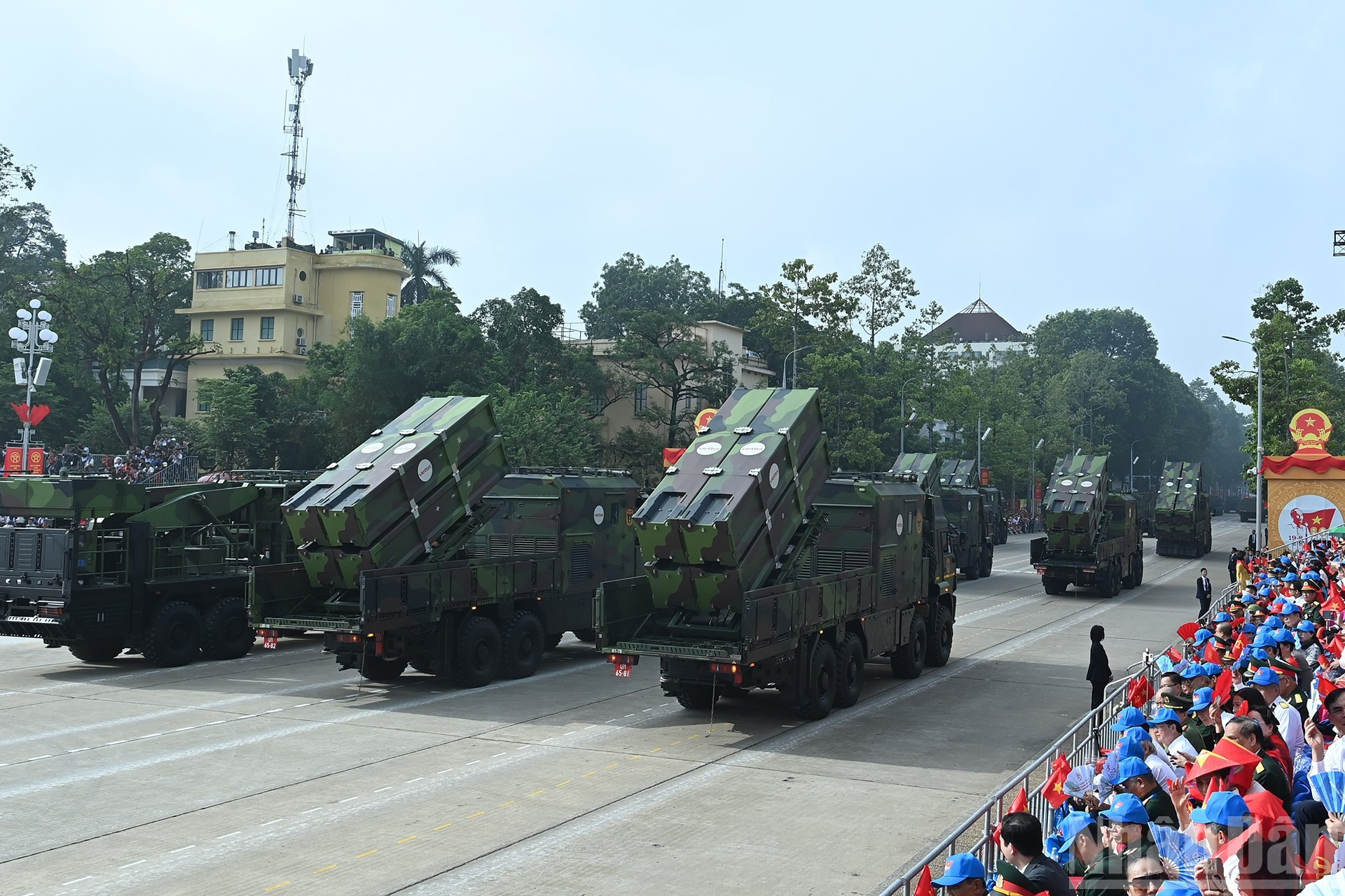 El bloque de tanques desfila por la Plaza de Ba Dinh. Bloque de tanques T-54B y T-55, verdaderas fortalezas de acero, está equipado con cañones de 100 mm y un sistema de ametralladoras, con gran poder de fuego y alta movilidad. En especial, la versión T-54B es modernizada y mejorada para cumplir con los requisitos del combate moderno. El moderno sistema de misiles costeros Redut-M de la Armada de Vietnam.