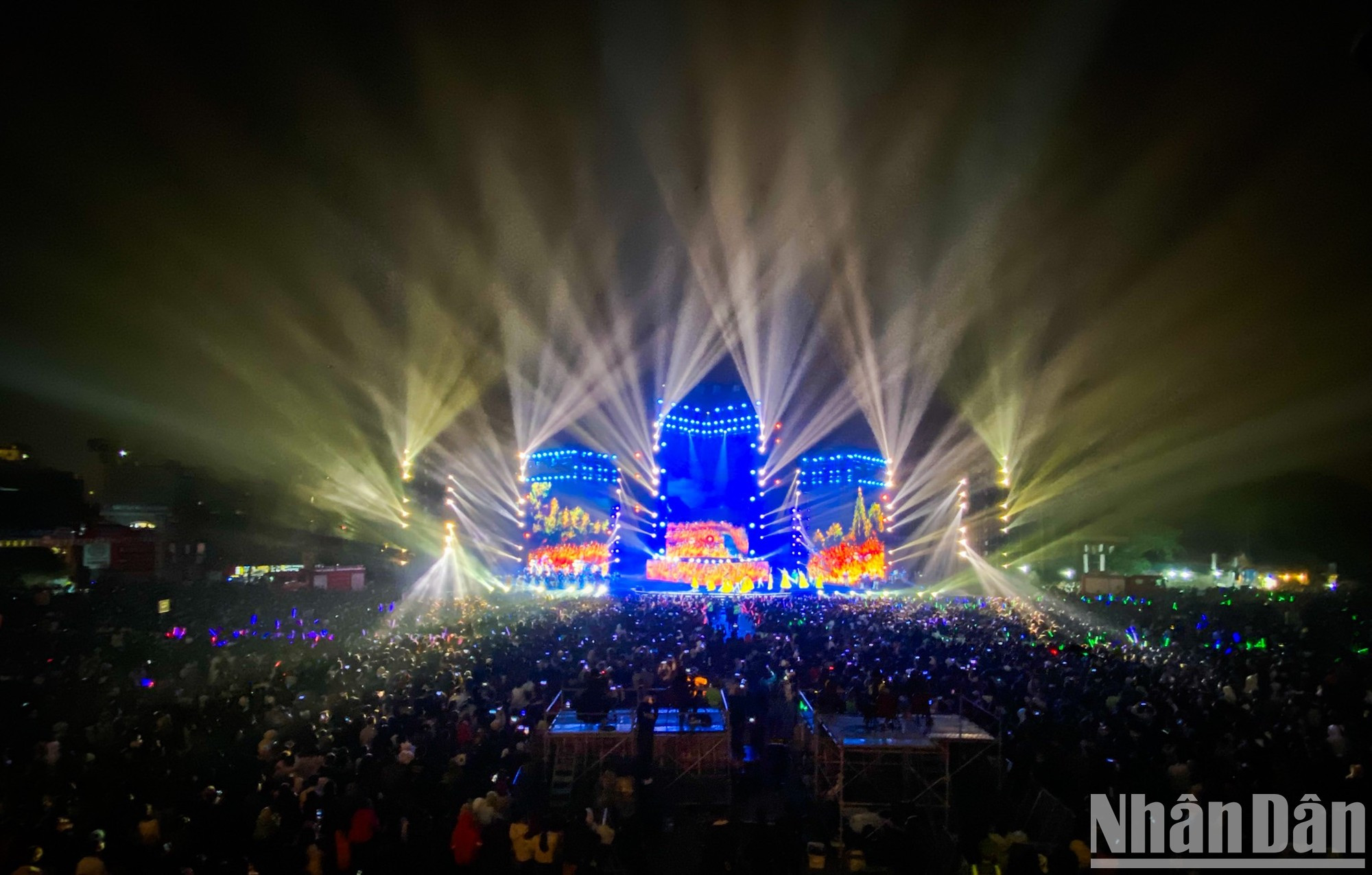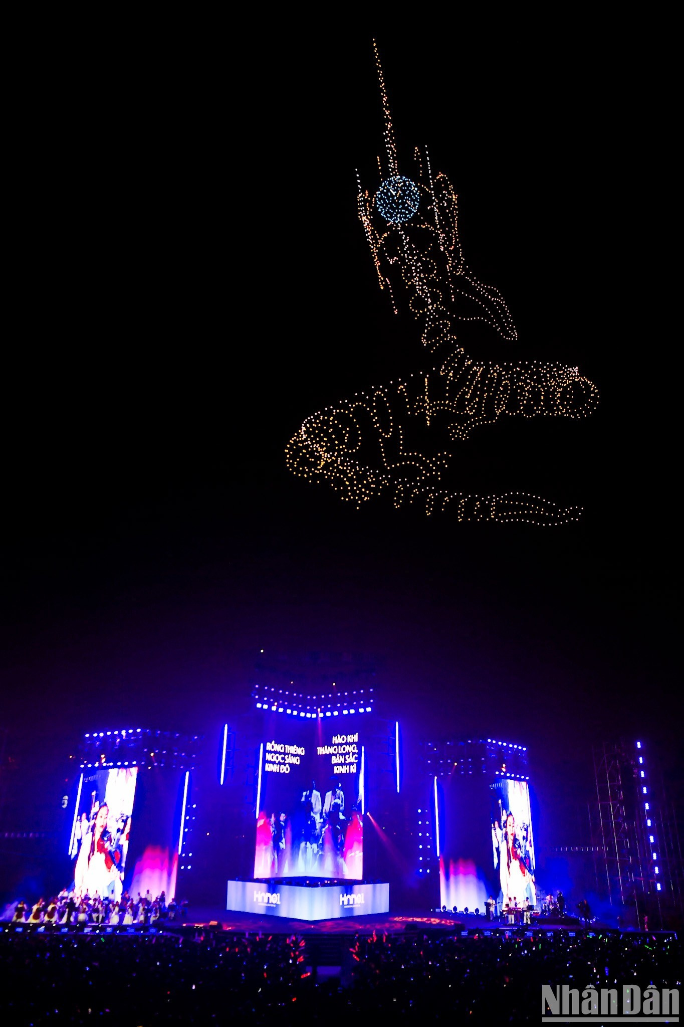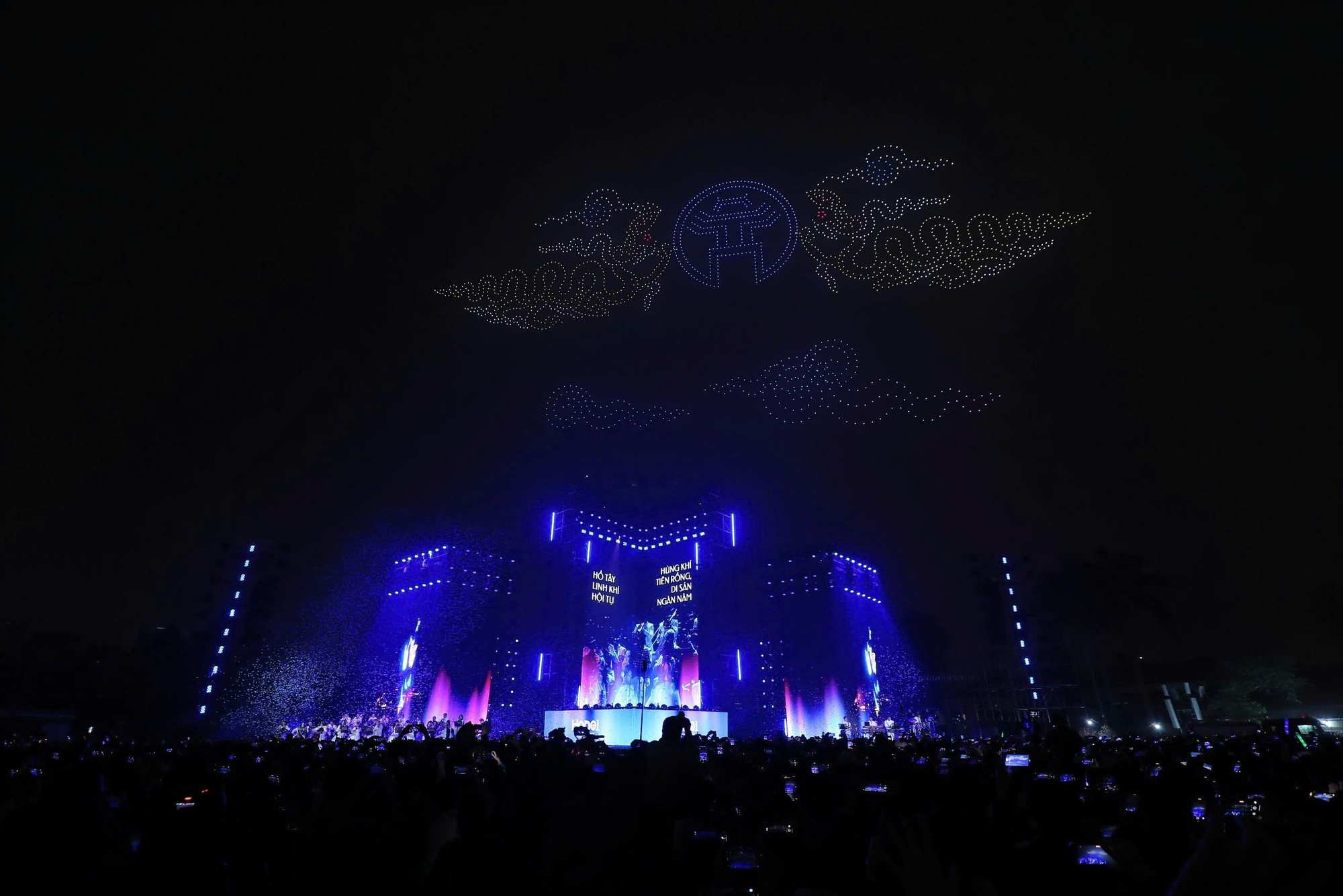 | El espectáculo de luces con drones recrea la imagen de un dragón en el cielo nocturno del lago del Oeste. El dragón no solo es un símbolo de Hanói, sino que también simboliza las aspiraciones de los habitantes de la capital en la era de engrandecimiento nacional. |