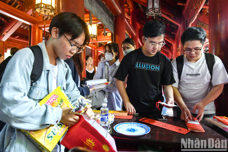 | En vísperas de una de las pruebas más importantes en su periplo educativo, a pesar de la lluvia, varios muchachos y sus familiares acuden al templo entre cuyas reliquias se halla “Quốc tử giám”, la primera universidad de Vietnam y símbolo del tradicional afán por aprender. |