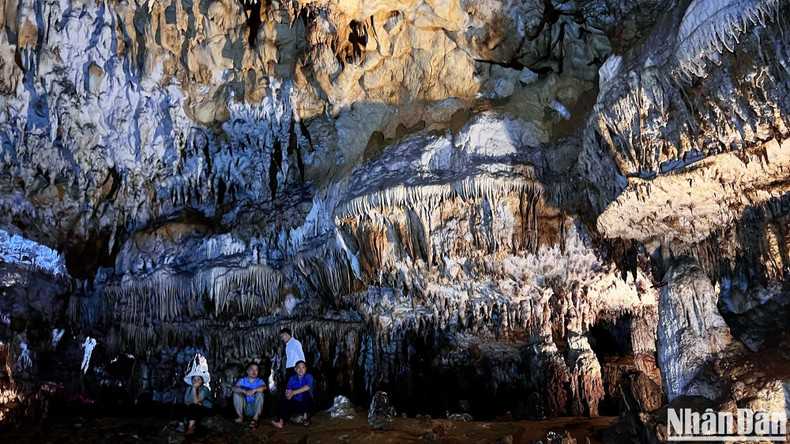 El Presidente del Comité Popular del distrito de Quan Son, Le Hong Quang (tercero a la derecha), guía a una delegación de funcionarios de recursos naturales y medio ambiente de la provincia vecina de Ninh Binh en una visita a la cueva de Bo Cung.
