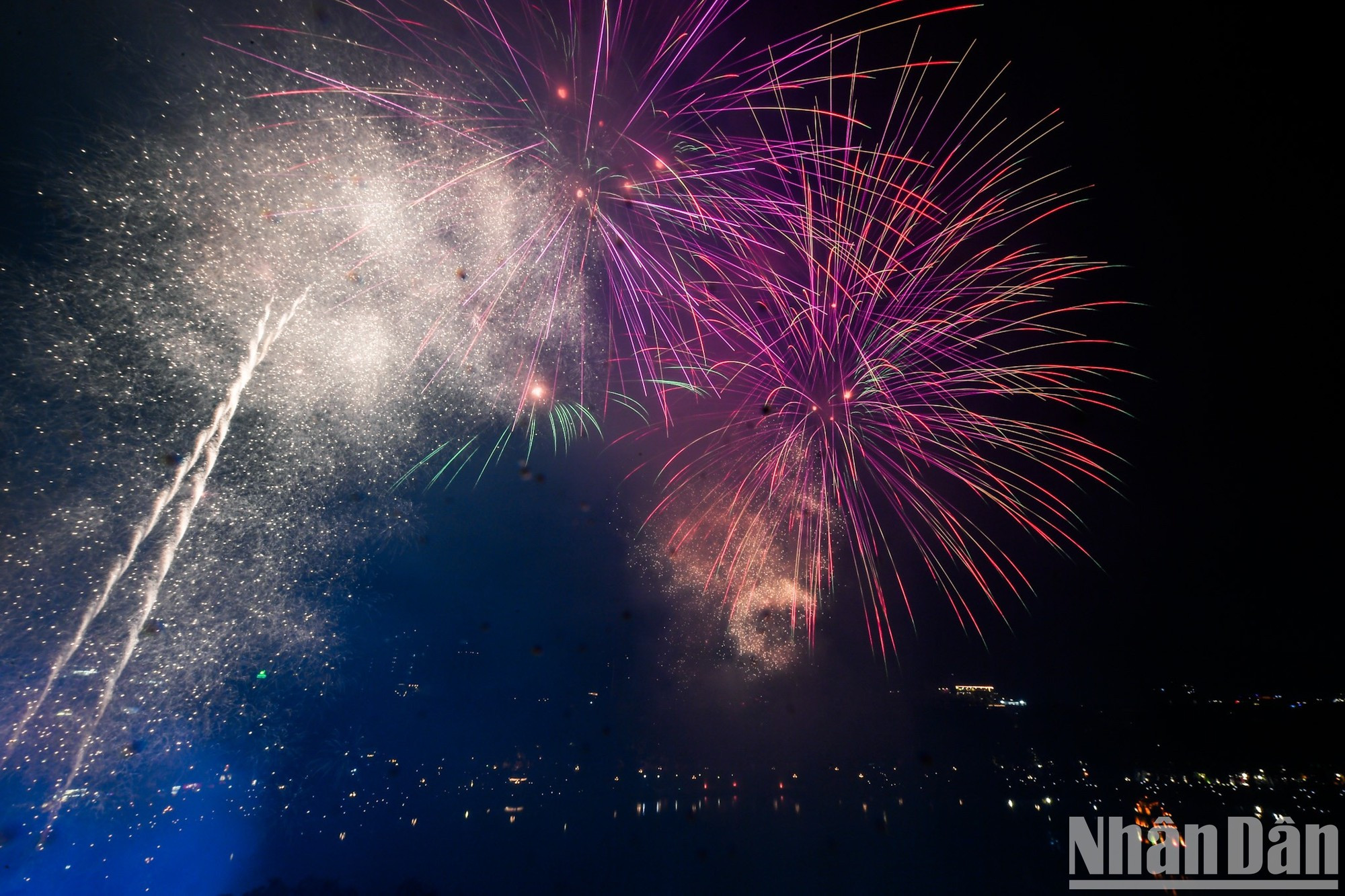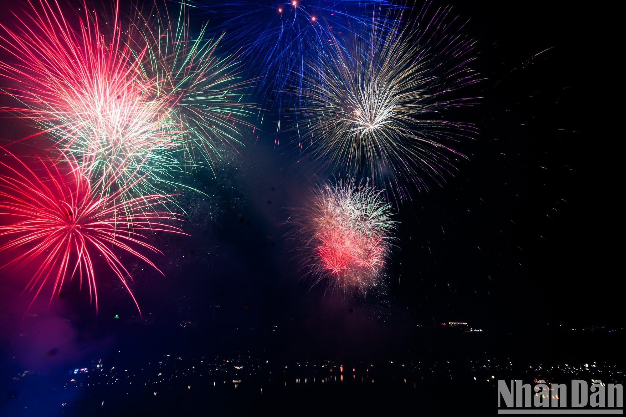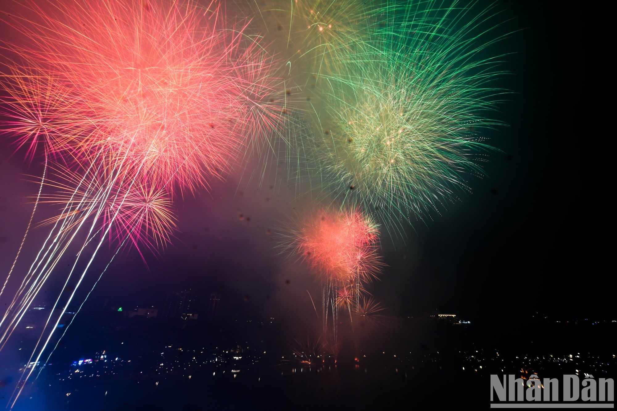 |   Los fuegos artificiales pintan el cielo nocturno de Hanói con destellos de luz.  |
