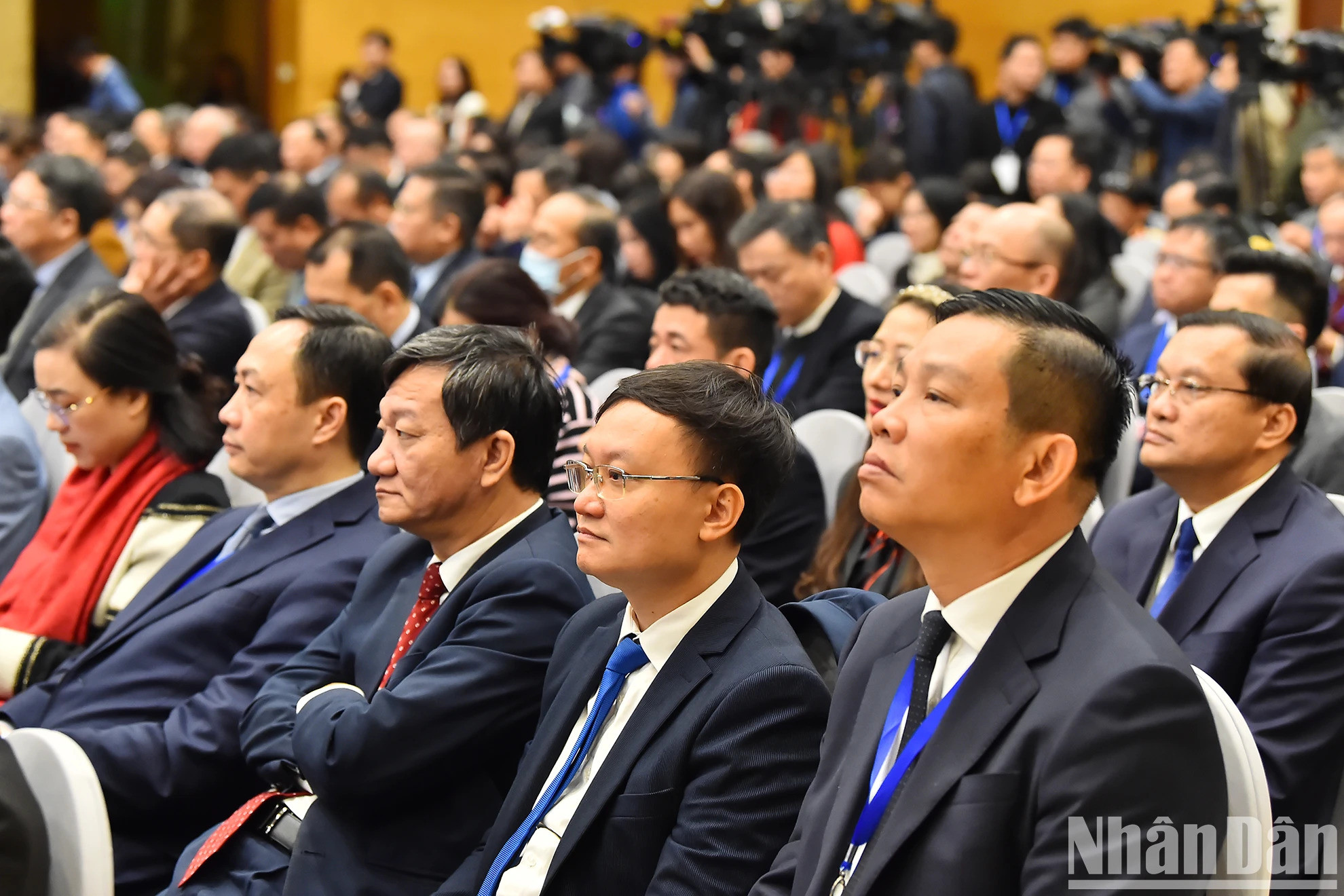 | Dirigentes del Ministerio de Relaciones Exteriores reciben al secretario general Nguyen Phu Trong en la sesión inaugural de la conferencia. |