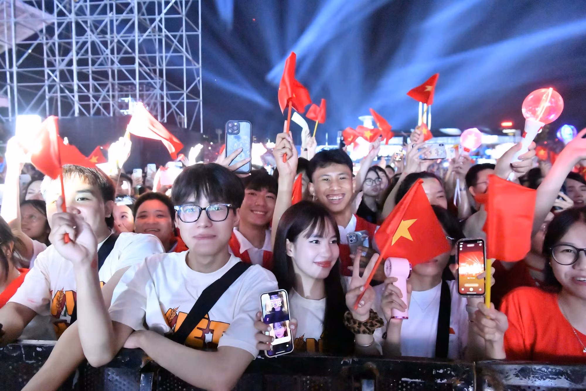 Una gran multitud de espectadores estuvo presente en el estadio My Dinh desde temprano.Un joven mocionado con su entrada al evento.Jóvenes posan con la entrada del programa.
