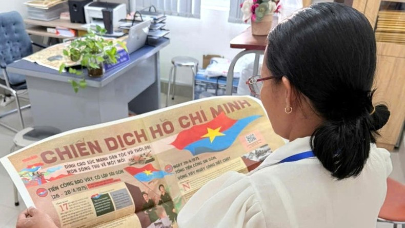 | Los estudiantes con la publicación informativa especial de Nhan Dan. |