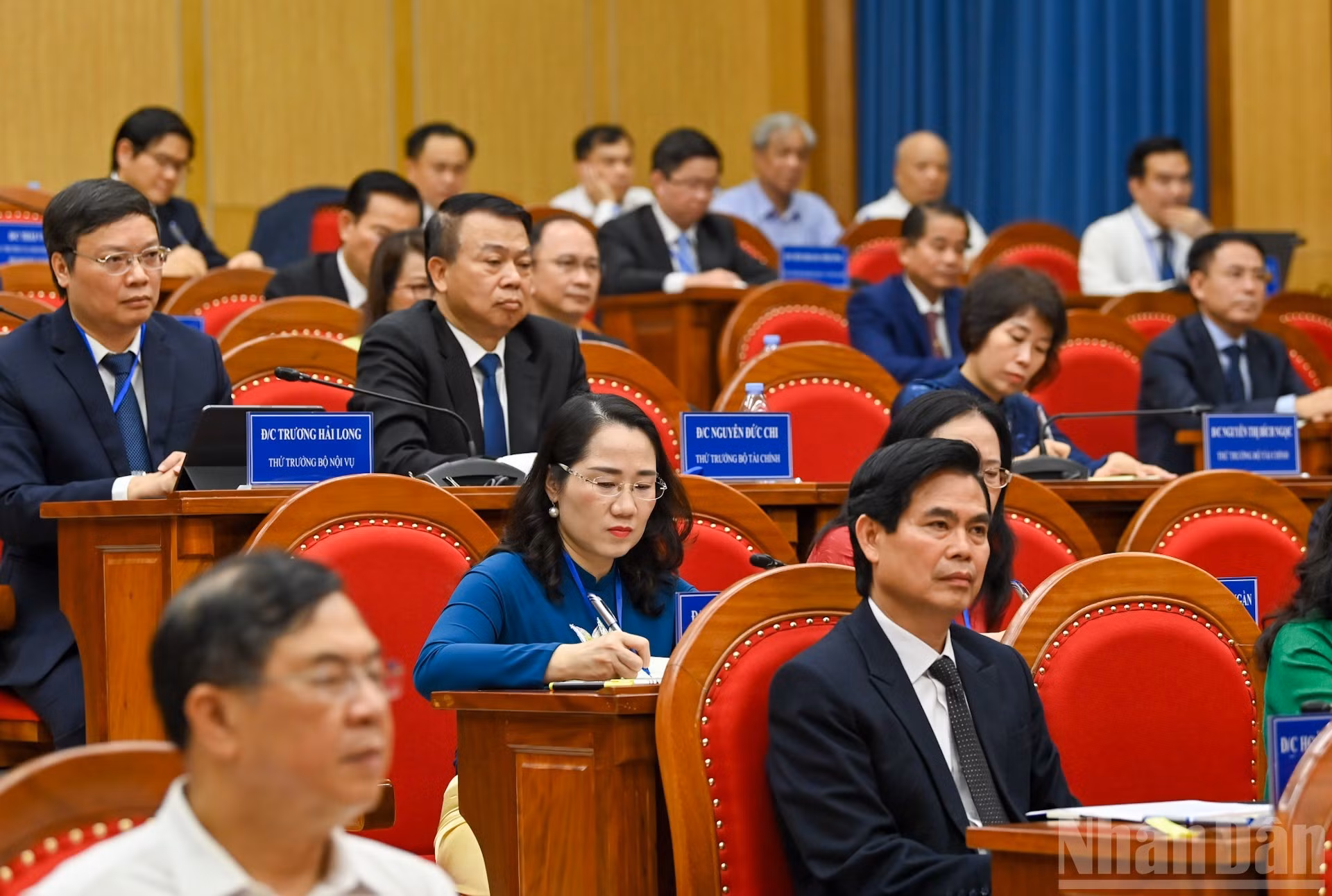 El secretario general del PCV, To Lam, y el miembro del Buró Político, director de la Academia Nacional de Política Ho Chi Minh, presidente del Consejo Teórico Central y subjefe permanente del Comité Directivo del curso, Nguyen Xuan Thang, llegan al encuentro.Miembros del curso.Xuan Thang habla en la reunión.