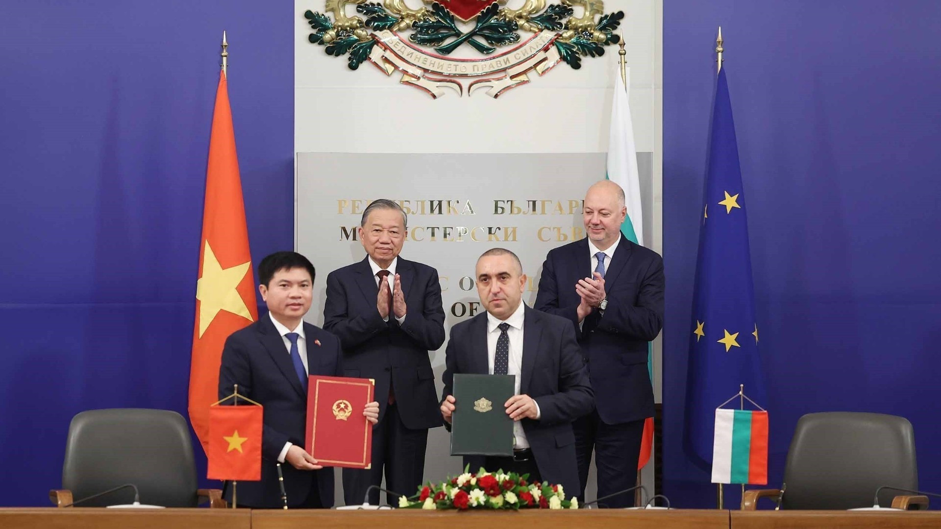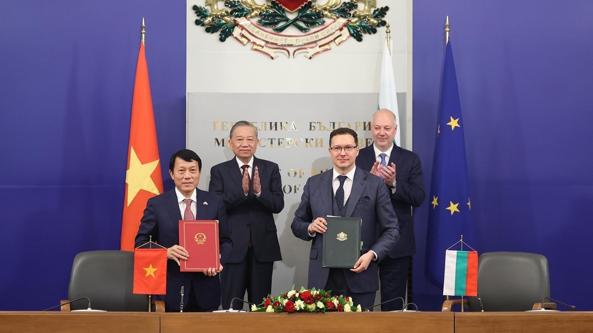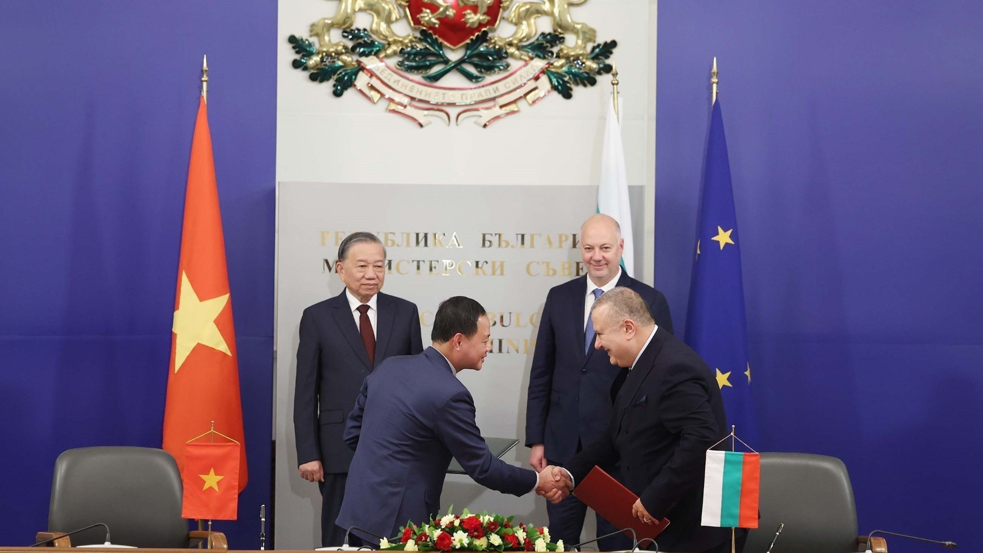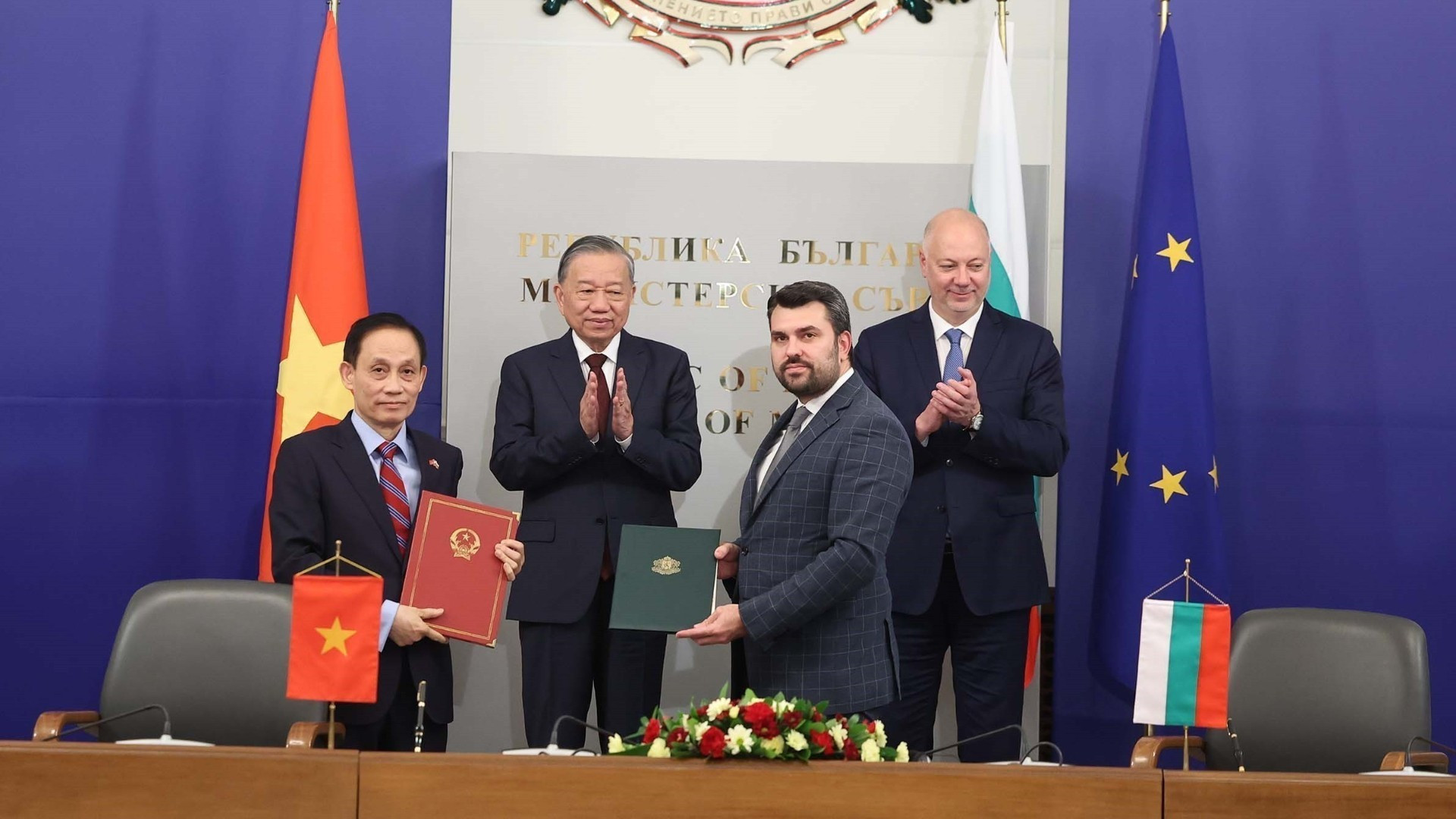 El secretario general del Partido Comunista de Vietnam, To Lam y el primer ministro búlgaro, Rosen Zhelyazkov, presencian el intercambio de un Memorando de Entendimiento sobre cooperación entre los Ministerios del Interior de Vietnam y de Trabajo y Política Social de Bulgaria en sector laboral y política social. (Foto: VNA)