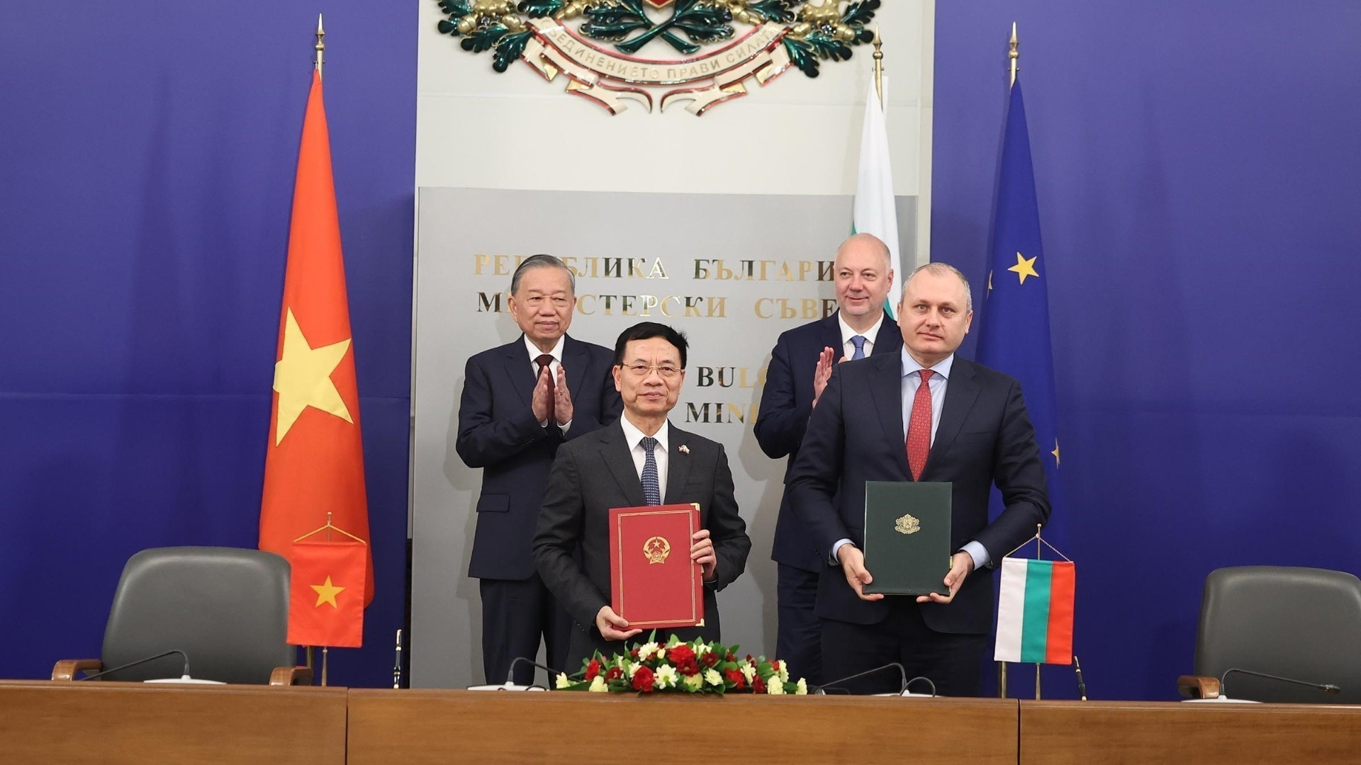 El secretario general del Partido Comunista de Vietnam, To Lam y el primer ministro búlgaro, Rosen Zhelyazkov, presencian la firma de un Memorando de Entendimiento sobre cooperación digital entre los Ministerios de Ciencia y Tecnología de Vietnam y de Gobierno Electrónico de Bulgaria. (Foto: VNA)