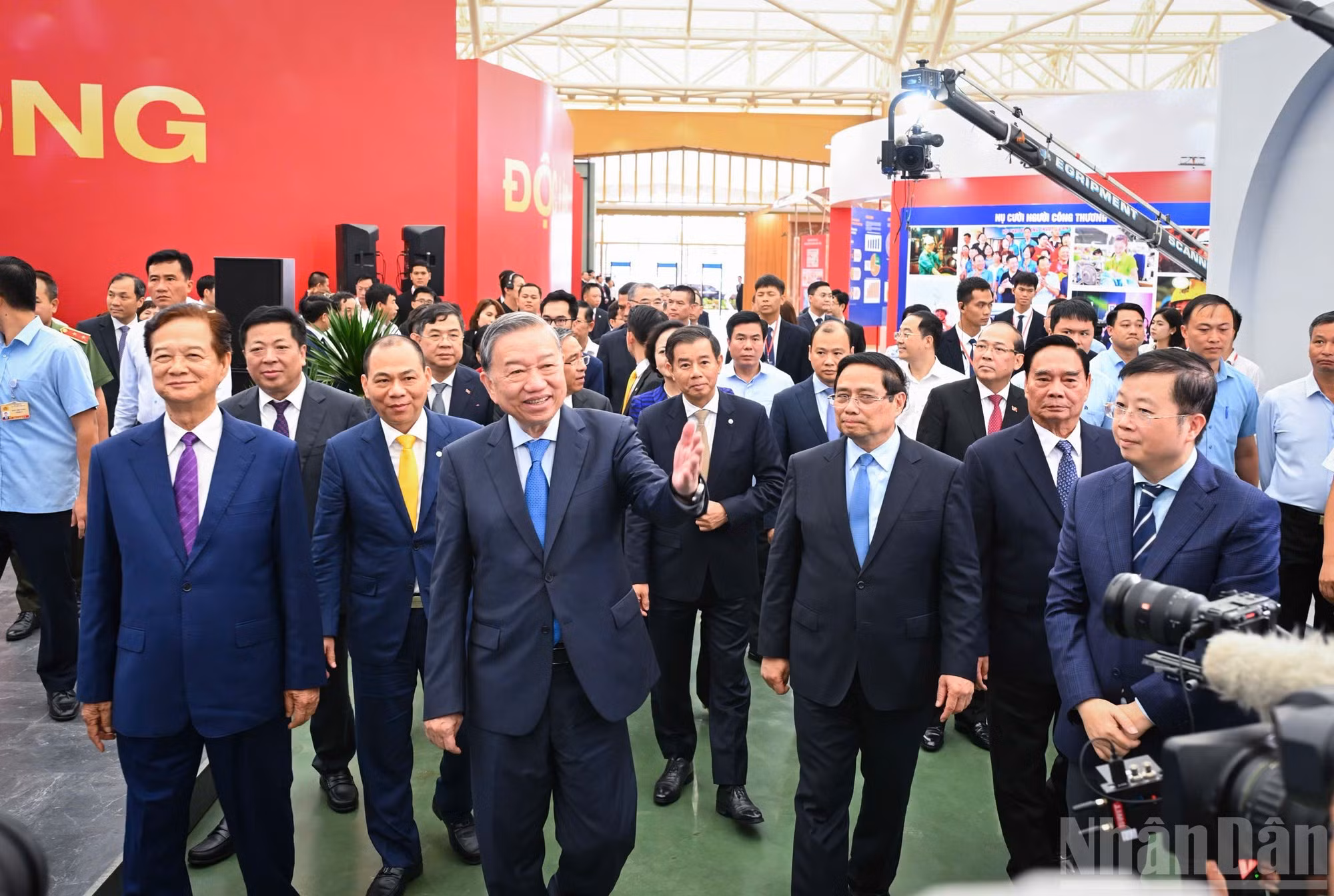El secretario general del Partido Comunista de Vietnam, To Lam, el primer ministro Pham Minh Chinh y los delegados visitan el Centro Nacional de Exposiciones y Ferias.