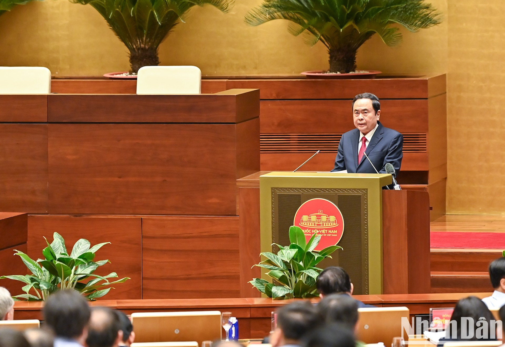 | El presidente de la Asamblea Nacional, Tran Thanh Man, presenta el tema sobre la enmienda de la Constitución y las leyes e instrucciones para la elección de diputados a la Asamblea Nacional de la XVI Legislatura y los Consejos Populares en todos los niveles para el período 2026-2031. |