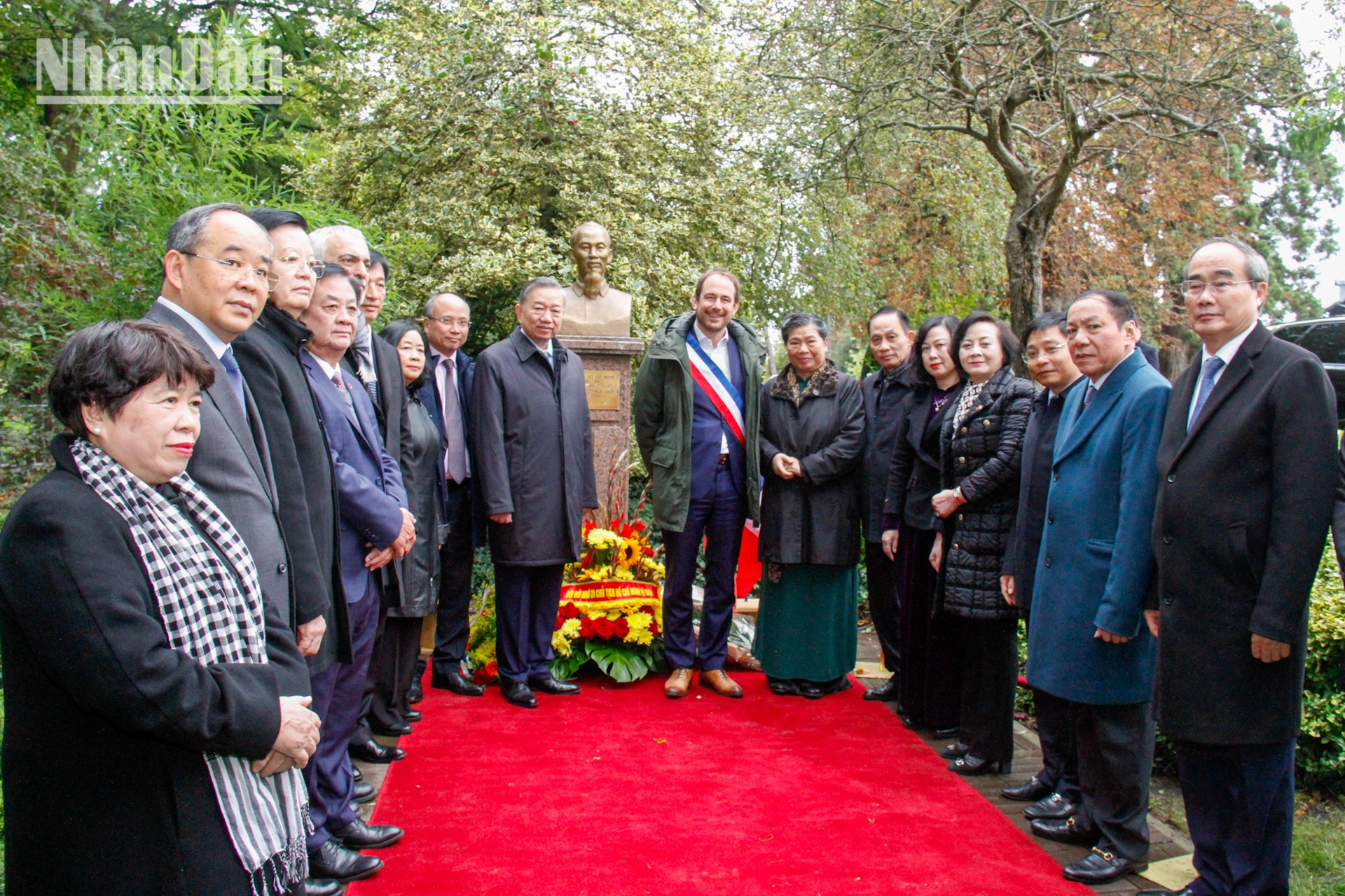 | El líder vietnamita y la delegación de alto nivel colocan flores en busto de Presidente Ho Chi Minh en la ciudad de Montreuil. |