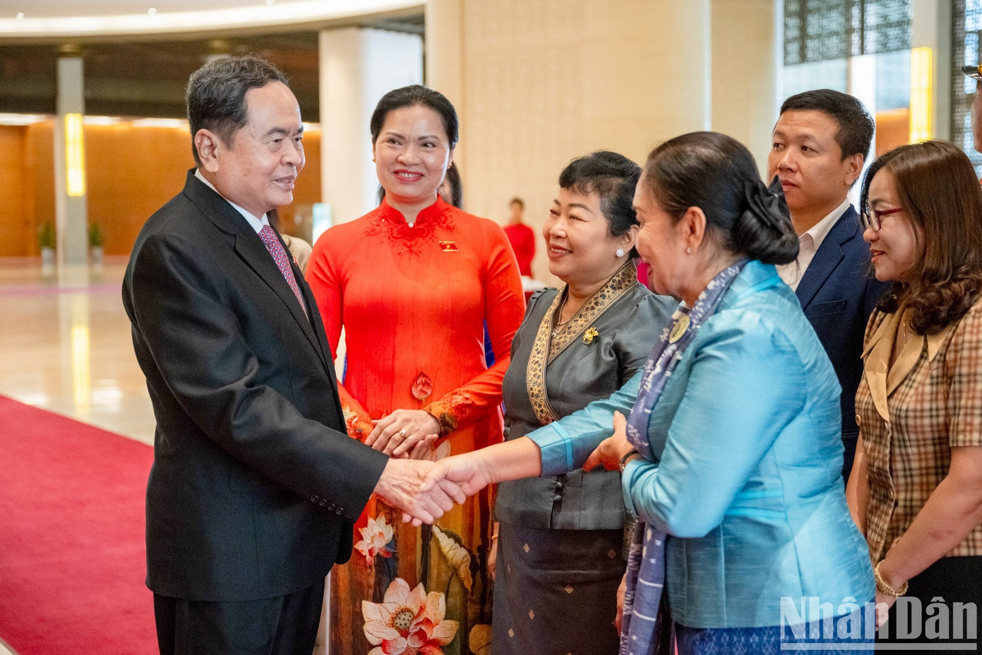 | El presidente de la Asamblea Nacional de Vietnam, Tran Thanh Man, con miembros de la Unión de Mujeres y empresarias de Laos y Camboya. |