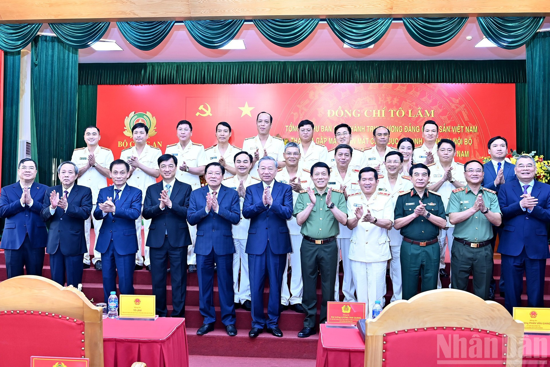 El máximo líder partidista To Lam visita el Departamento de Seguridad Política Interna del Ministerio de Seguridad Pública. El máximo líder partidista To Lam visita el Departamento de Seguridad Política Interna del Ministerio de Seguridad Pública. El secretario general To Lam saluda a oficiales del Departamento de Seguridad Política Interna del Ministerio de Seguridad Pública. El máximo líder partidista To Lam y dirigentes del Partido y Estado asisten al encuentro.