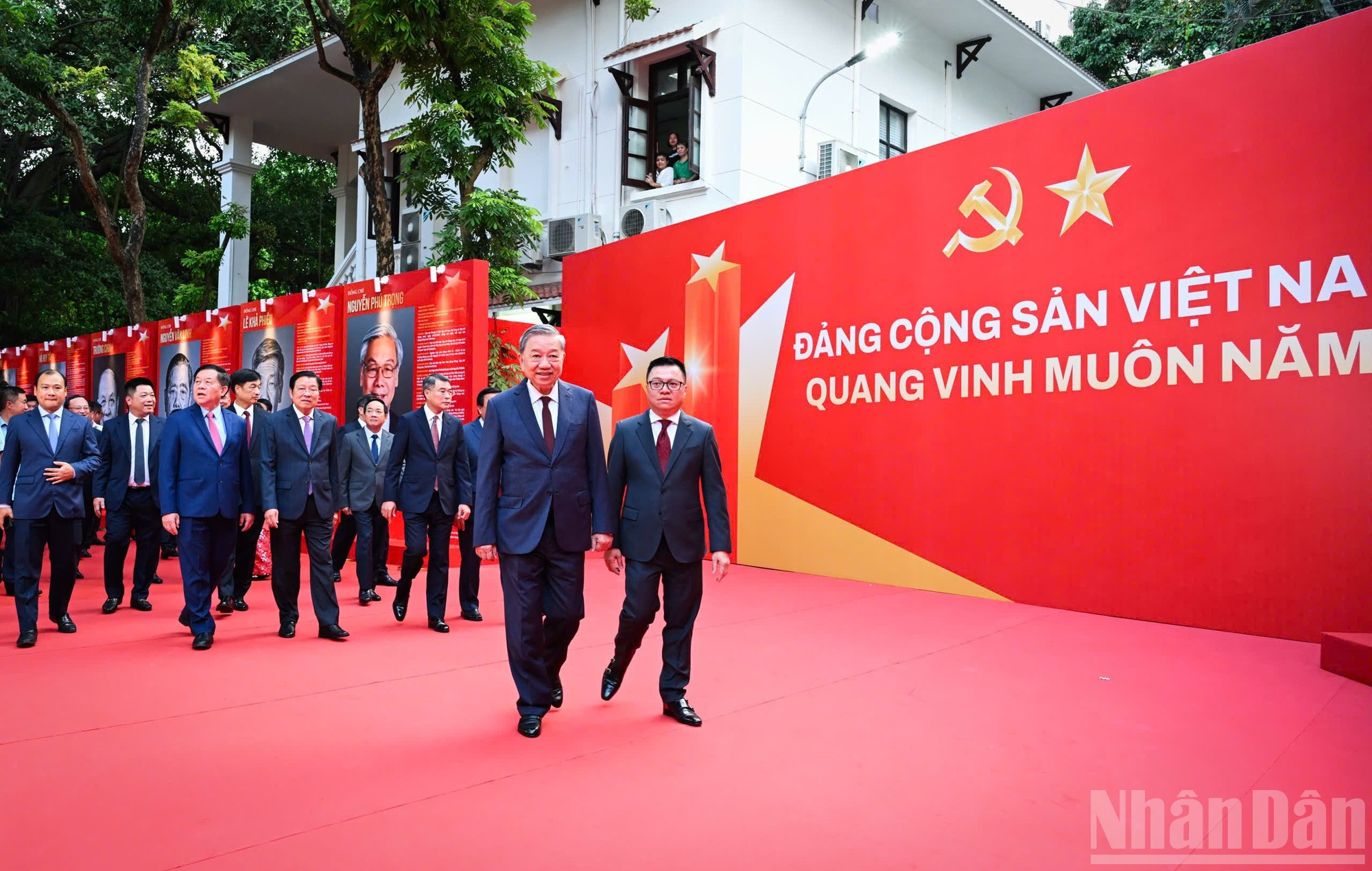El secretario general del Partido Comunista de Vietnam, To Lam, visita la Sala de Tradición del periódico Nhan Dan. El dirigente partidista de Vietnam, To Lam, y los periodistas de Nhan Dan. El presidente-editor del diario, Le Quoc Minh (a la derecha) recibe al secretario general To Lam. El secretario general, To Lam, y otros dirigentes del partido y el Estado visitan una exposición que presenta retratos y reseñas biográficas de los secretarios generales del partido. El secretario general del PCV, To Lam, interviene en la cita.