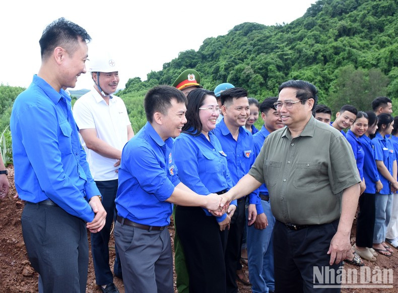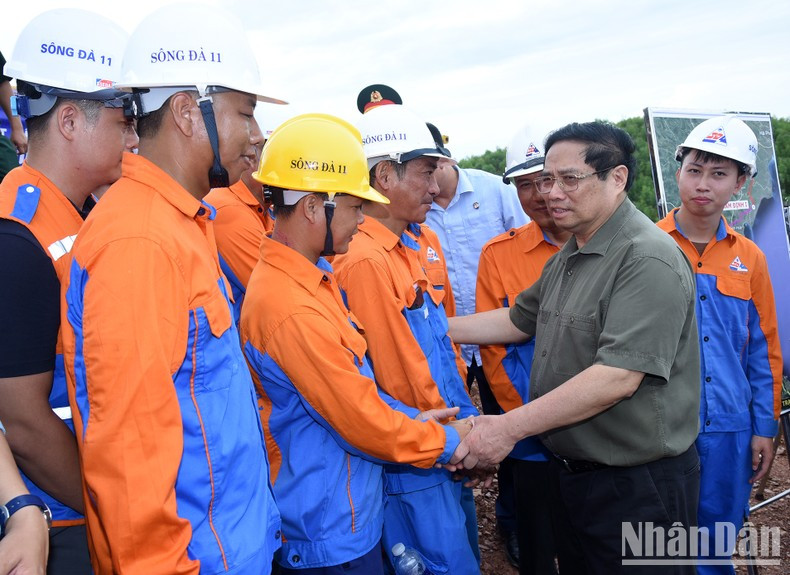 | El primer ministro de Vietnam, Pham Minh Chinh, y los trabajadores en la obra. |