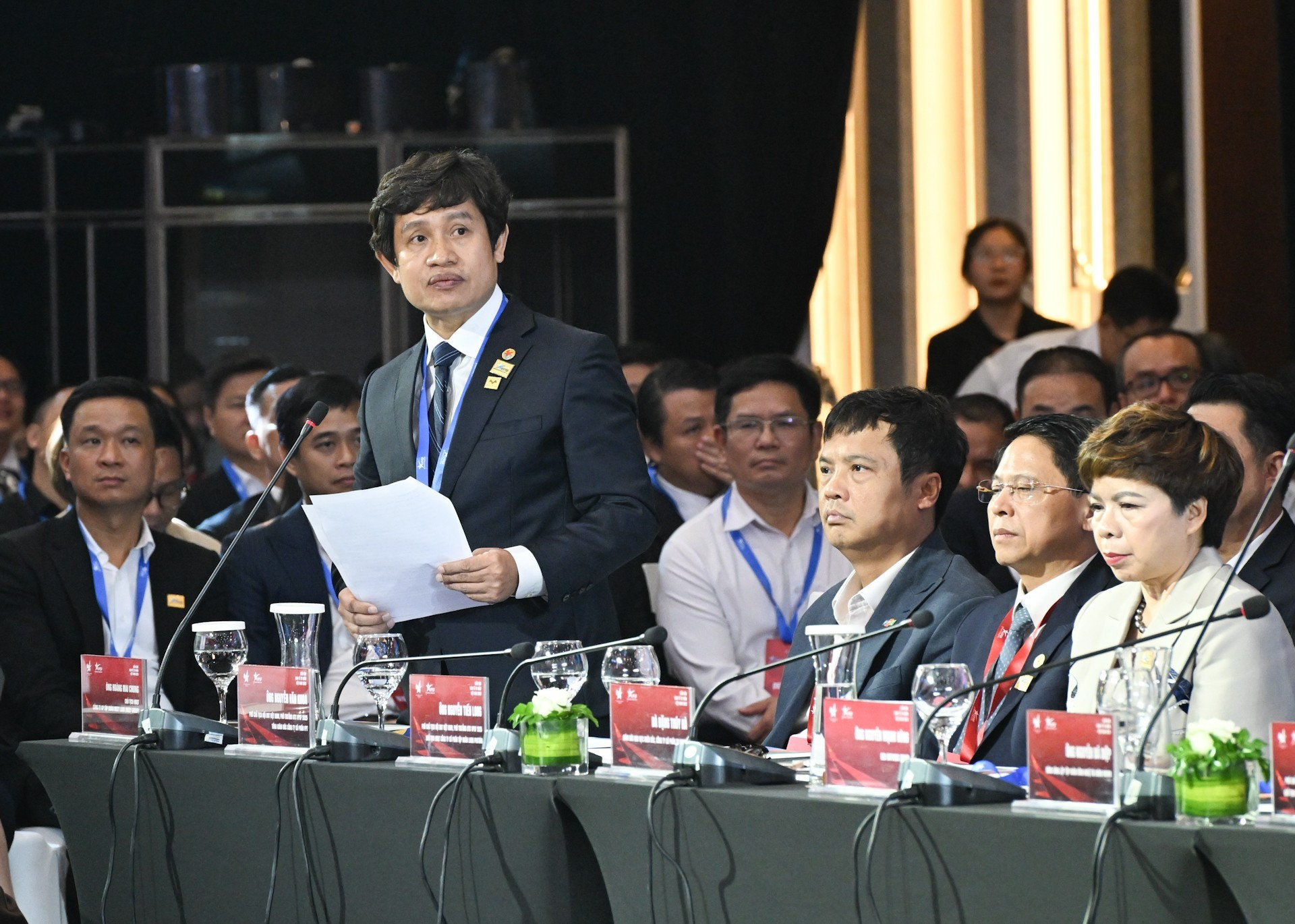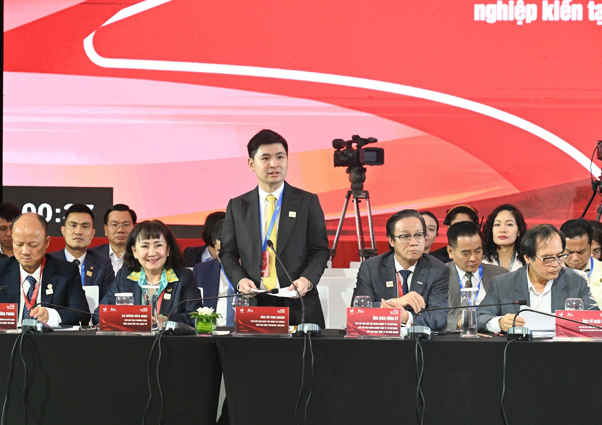El jefe de Gobierno llega al evento. El presidente de la Asociación de Empresarios Jóvenes de Vietnam y titular del VPSF 2025, Dang Hong Anh, interviene en la cita. El premier Pham Minh Chinh y delegados a la reunión.