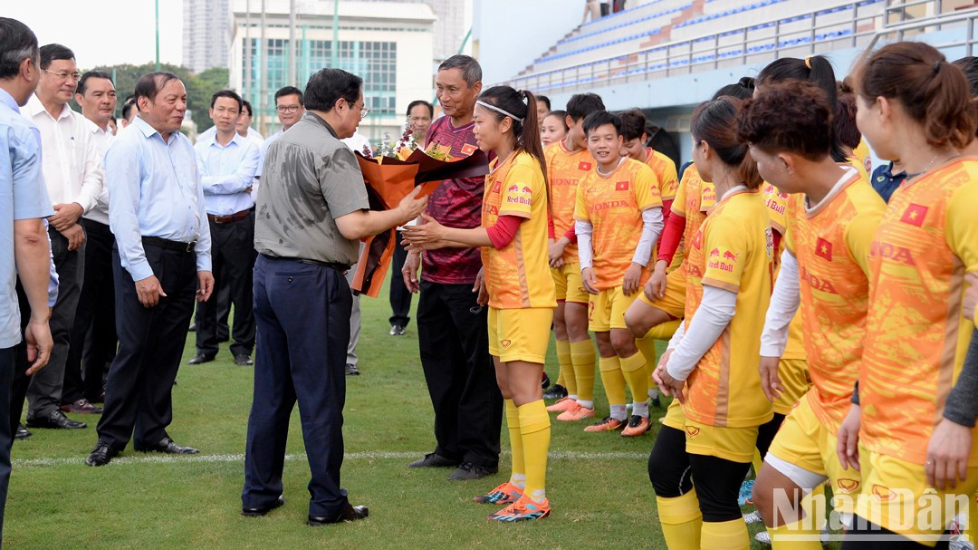 | El premier entrega flores y regalos al cuerpo técnico y las jugadoras. |