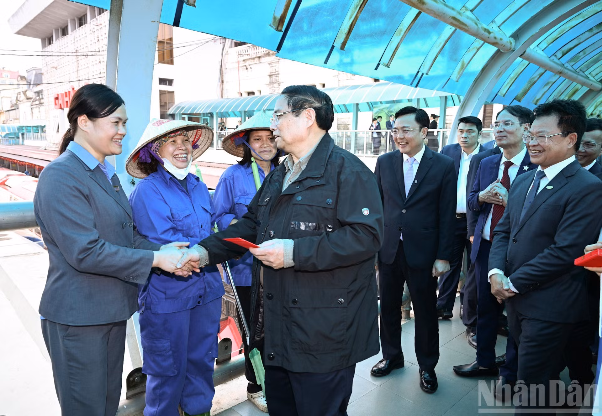 El primer ministro Pham Minh Chinh visita y felicita por el Año Nuevo Lunar a las entidades de construcción del proyecto de línea ferroviaria urbana Nhon–Estación de Hanói.