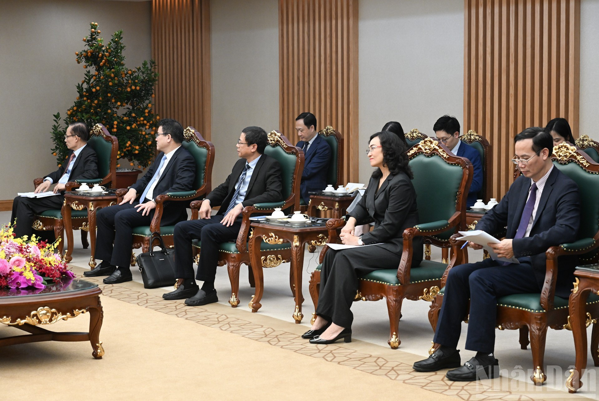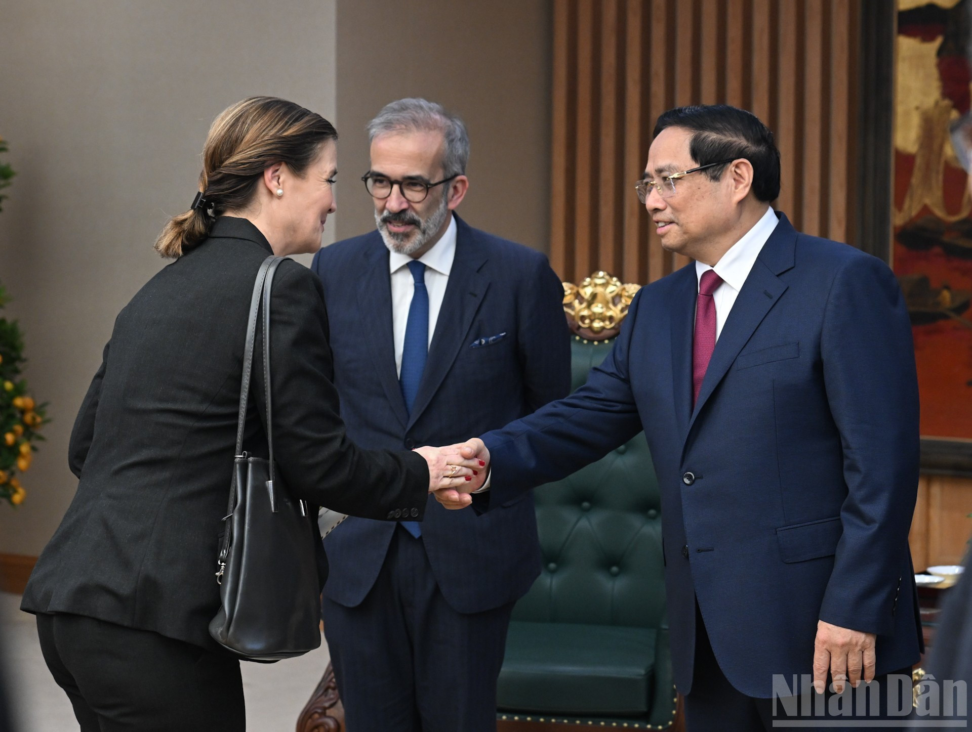 El primer ministro vietnamita, Pham Minh Chinh, recibe a los miembros que acompañan al ministro de Estado y de Asuntos Exteriores de Portugal, Paulo Rangel.