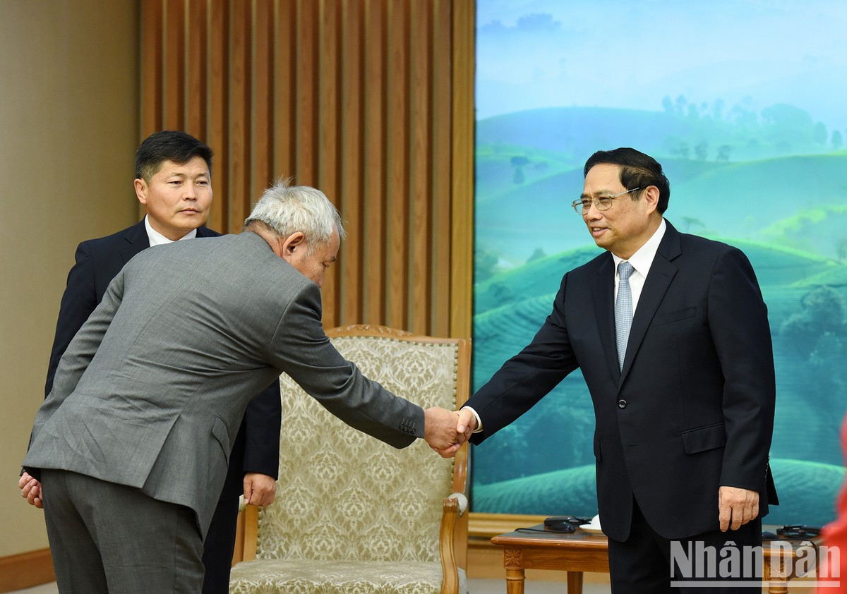 | El primer ministro de Vietnam, Pham Minh Chinh (derecha), y el ministro de Justicia y Asuntos Interiores de Mongolia, Khishgee Nyambaatar. |