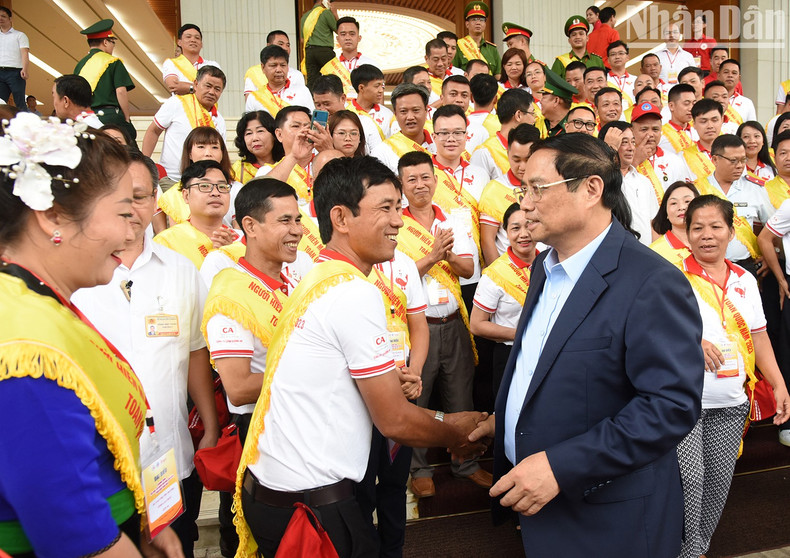 | El primer ministro Pham Minh Chinh saluda a los 100 destacados donantes voluntarios de sangre. |