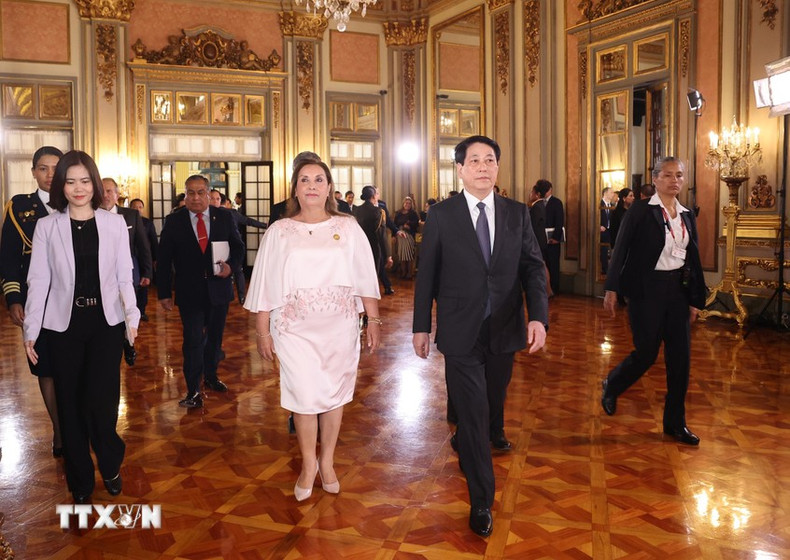 | La presidenta peruana, Dina Ercilia Boluarte Zegarra, recibe a su par vietnamita, Luong Cuong. |